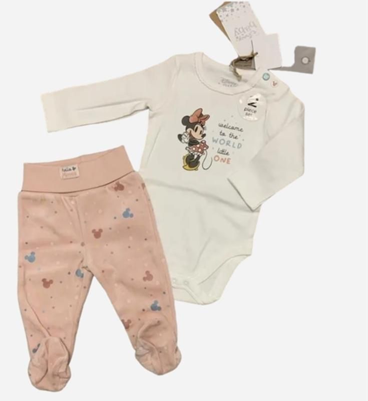 - komplet niemowlęcy dla dziewczynki - rozmiar 74 cm - body - 100% bawełna (gramatura 180 g/m2) - napy na na ramieniu i w kroku - dzianina interlock - półśpiochy - 80% bawełna, 20% poliester (gramatura 300 g/m2) - welurowy materiał - nad piętami specjalne gumki, które uniemożliwiają zsuwanie się ze stópek - wywijany pas - licencja: Myszka Minnie