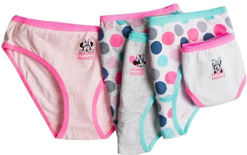 Zestaw majtek z Myszką Minnie dla dziewczynki. Dobrze dobrana bielizna to podstawa komfortu i higieny każdego dnia. Najwyższej jakości, bezpieczne dla skóry dziecka materiały oraz funkcjonalny fason są gwarancją wygody i zadowolenia. 5 par majtki w różnych kolorach i wzorach, z Myszką Minnie wysokogatunkowa bawełna z certyfikatem Oeko-Tex Standard 100, pozwala swobodnie oddychać delikatnej skórze dziecka fason figi miękka i elastyczna tkanina zapewnia komfort noszenia i doskonałe dopasowanie do sylwetki ażurowe wykończenie w pasie oraz ozdobna kokardka z przodu, dopasowana kolorystycznie do nadruku