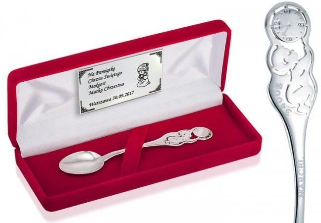 Srebrna łyżeczka z wizerunkiem dziecka 925Łyżeczka prezentowana na tej aukcji jest idealnym prezentem na wszelkiego rodzaju okazje dla maluchów - w szczególności polecamy jako prezent na Chrzest Święty bądź jako pamiątka narodzin. Indywidualna dedykacja oraz grawer, sprawią że prezent będzie wyjątkowy i jedyny w swoim rodzaju. Łyżeczka wykonana jest w całości ze srebra w próbie 925. Grawerowanie danych na łyżeczce, etui oraz indywidualna dedykacja są gratis.Wymiary:Długość: 10,8 cmSzerokość: 1,7 cmWaga: ok 11 gPróba: srebro 925Grawerowanie, etui, dedykacja:Na łyżeczce istnieje możliwość wygrawerowania (w cenie produktu) takich informacji jak:ImięDataWagaWzrostGodzinaDostępne do wyboru są dwa kolory etui granatowe lub bordowe. Dodatkowo w cenie produktu oferujemy możliwość wygrawerowania dowolnej dedykacji dołączanej do etui. Treść dedykacji oraz informacji do grawerowania na łyżeczce, prosimy przesłać po zakupie na adres mailowy sklepu. Oferujemy Państwu wiele czcionek oraz symboli do umieszczenia na dedykacji, można je zobaczyć TUTAJ....
