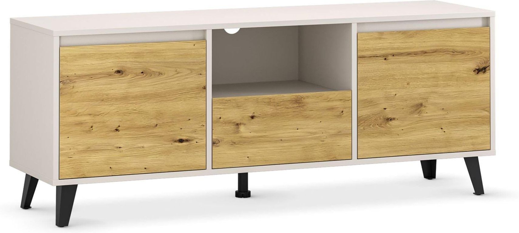 Szafka RTV z kolekcji BORG Szafka RTV z kolekcji Borg Szafka RTV w zestawieniu kaszmiru z dekorem dąb artisan to stylowe połączenie ciepłych tonów drewna z delikatnym beżem. Naturalne wykończenie ociepla wnętrze, a przemyślany układ – szafki, szuflada i półka z otworem na kable – gwarantuje pełną …