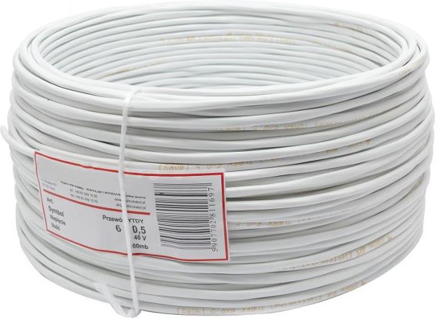 Przewód 6 x 0.5 mm Do systemów alarmowych i instalacji domofonowych Nie łamie się ! Nasz przewód jest w 100% produktem krajowym i wykonywany bez domieszki innych metali, dlatego też gwarantuje niezawodność i wysoką jakość wykonania. Zastosowanie Przewody YTDY przeznaczone są do wykonywania instalacji nisko-napięciowych, takich jak zdalnego sterowania, przesyłania sygnałów, transmisji danych. Stosowane są również w telefonii, instalacji urządzeń alarmowych i domofonów. Budowa Przewód złożony jest z 6 kolorowych żył o przekroju 0,5mm2 Żyły jednodrutowe, wykonane z miedzi, o przekroju 0,5 mm2 Izolacja żył(kolorowa) wykonana z polwinitu izolacyjnego (PVC) Żyły izolowane skręcone w ośrodek, Powłoka kabla wykonana ze specjalnego polwinitu oponowego (PVC) w kolorze białym Uwaga Kupując na naszej aukcji masz pewność wysokiej jakości produktu, przewód który Państwu oferujemy jest wykonany w Polsce, proszę uważać na tańsze i dużo gorszej jakości odpowiedniki na aukcjach konkurencji! Cena dotyczy 100 metrów przewodu (1szt = 100 metrów przewodu) W skład zestawu wchodzi przewód YTDY 6x0.5mm 100 metrów ( nr kat. 4243 ) pisemna karta gwarancyjna, 12 miesiecy gwarancji faktura VAT lub paragon fiskalny