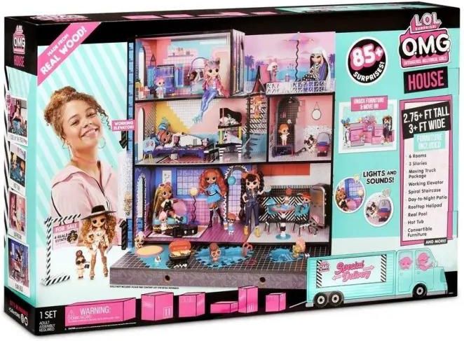 Ogromny, LOL OMG Domek Surprise! dla każdej wielbicielki laleczek L.O.L. Dzięki niemu przechowywanie laleczek, zwierzątek i akcesoriów to już nie problem! Ponad 85 akcesoriów pozwala urozmaicić zabawę. Wszystkie te niespodzianki ukryte są w kartonowym samochodzie dostawczym. Aby je odkryć należy otwierać różne pudełka. Wśród niespodzianek znajdują się mebelki i elementy wyposażenia. Ten ogromny, wykonany z prawdziwego drewna domek, składa się z salonu, w którym znajdziemy prawdziwą, świecącą lampę, kuchni z jadalnią, sypialni, w której zostało umieszczone podwójne łóżko dla laleczek z gondolą, łazienki, w której będzie można kąpać laleczki, oraz ogromnej garderoby, gdzie dla laleczek przygotowano stojak z wieszakami na ubranka, a także toaletkę z szufladami. NOWA grafika i meble - Ponad 85 niespodzianek - Drewniany piętrowy dom - Funkcje interaktywne, w tym działająca winda, światła i dźwięki na 3 piętrach, prawdziwy basen, spa i piaskownica - Ciężarówka do przenoszenia i meble do rozpakowania