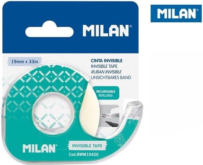 Taśma MILAN samoprzylepna niewidoczna 19 mm x 33 m na dyspenserze z metalowym ostrzem wielokrotnego użytku. Matowa taśma, na której możesz pisać. Bardzo dobrze trzyma. Można ją odkleić nie uszkadzając powierzchni. Nie żółknie z czasem. Średnica taśmy 5,5 cm.