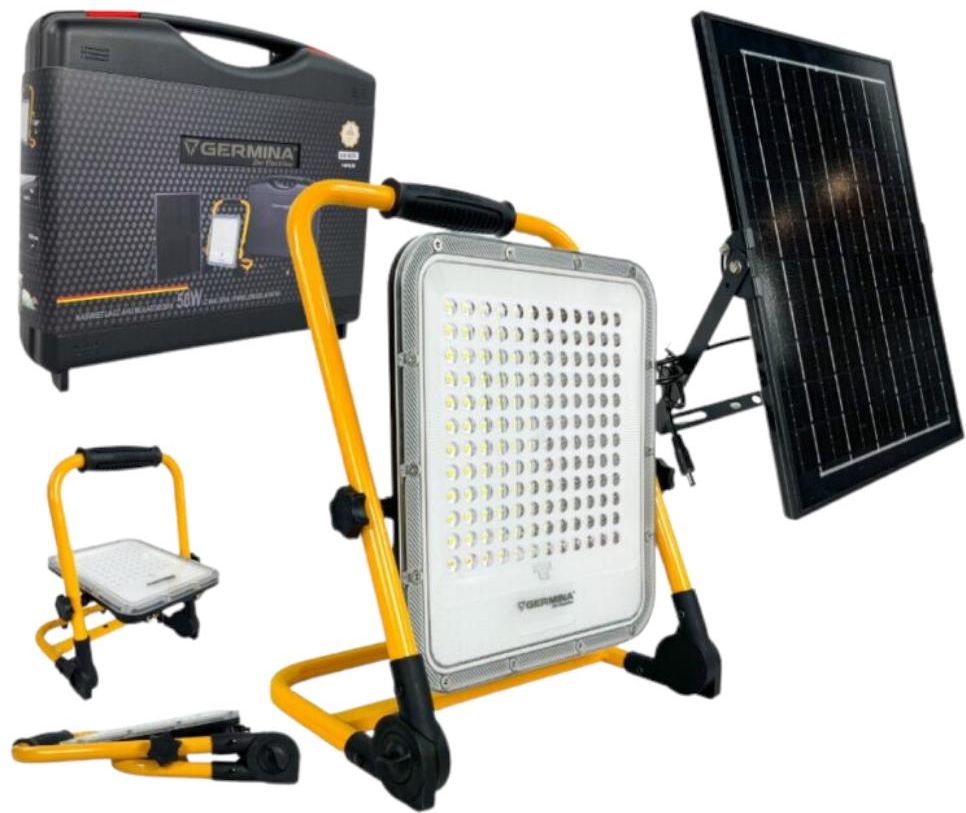 Naświetlacz LED 30W z akumulatorem, panelem solarnym i walizką GŁÓWNE CECHY PRODUKTU: ✅ Klasa odporności IP65, zapewni ochronę na niekorzystne warunki atmosferyczne. Naświetlacz wykonany jest ze specjalnego, odpornego na upadki, nie tłukącego się tworzywa.✅ Lampa jest energooszczędna dzięki zastosowanym diodom LED.✅ Halogen 5000K przyjazna dla oka neutralna barwa światła, która najlepiej odwzorowuje światło dzienne.✅ Zapewnia równomierny przepływ światła i maksymalną moc już od pierwszej sekundy pracy.✅ Naświetlacz, dzięki wbudowanemu akumulatorowi, pozwala na przenoszenie go w dowolne miejsce. Sprawdzi się nawet tam gdzie nie mamy dostępu do energii elektrycznej.✅ Panel solarny pozwala na naładowanie lampy nawet w miejscu bez dostępu do prądu PARAMETRY PRODUKTU: ▶️ Model: Naświetlacz akumulatorowy 30W ze statywem i panelem solarnym▶️ Moc: 30 W▶️ Strumień świetlny: 1000 lm▶️ Jakość światła: Ra 80▶️ Temperatura barwowa światła: 5000K (światło dzienne)▶️ Częstotliwość: 50/60 Hz▶️ Żywotność: 30000 godzin (1250dni ciągłego świecenia)▶️ Klasa ochronności: I▶️ Norma szczelności: IP 65▶️ Temperatura pracy: -20°C ~ +50°C▶️ Wymiary naświetlacza: 19x16cm▶️ Wymiary ze statywem: 28x23,5x21cm▶️ Pojemność baterii: 5000 mAh▶️ Trzy poziomy jasności: 20% maksimum (działa do 12 godzin) 60% maksimum (działa do 9 godzin) 100% maksimum (działa do 4 godzin) Uniwersalne zastosowanie ⏺ stadionach⏺ magazynach⏺ garażach⏺ warsztatach⏺ obiektach gastronomicznych⏺ boiskach sportowych⏺ halach przemysłowych⏺ sklepach⏺ parkingach Opis produktu: 1️⃣ Port ładowania (ładowarka w zestawie)2️⃣ Przycisk do włączania oraz wybierania trybów świecenie (aby wyłączyć naświetlacz wystarczy przytrzymać przycisk dłużej) ❗️Montaż na wysokim statywie❗️Dzięki dodatkowej belce montażowej (belka jest dołączona do statywu) naświetlacz można zamontować na wysokim statywie. Opakowanie zawiera: ⏹ Statyw ( regulowany 360°)⏹ Panel solarny⏹ Walizka do przechowywania⏹ Naświetlacz 30W z akumulatorem⏹ Ładowarka