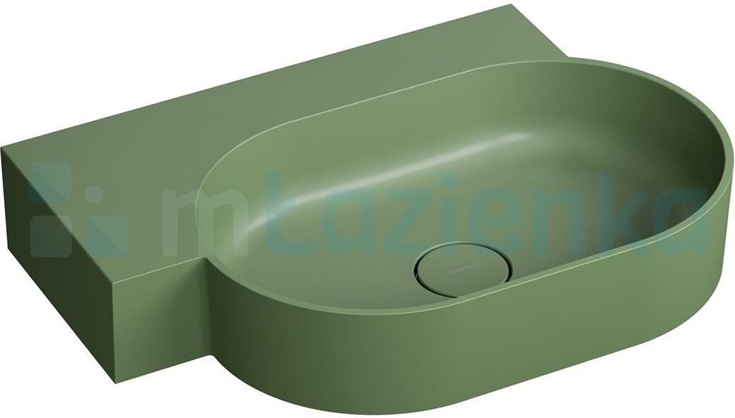 Umywalka z kolekcji OMNIRES OVO charakteryzuje się minimalistyczną, wyrazistą formą o doskonałych proporcjach. Powstały z zabawy geometrią kształt tworzą dwa przeciwległe półokręgi umywalki, połączone z prostokątną, funkcjonalną półką – idealnym miejscem do montażu baterii, a także do odstawienia kosmetyków czy innych niezbędnych akcesoriów. Harmonijnie wyprofilowane ścianki zostały wykończone płaskim, podkreślającym formę rantem, a idealnie dopasowana maskownica odpływu gwarantuje najwyższą estetykę. Od spodu umywalki zaprojektowano dyskretne, fabrycznie podcienione punkty, które wskazują miejsca na wykonanie otworów pod baterię lub dozownik, umożliwiając elastyczne dopasowanie armatury do indywidualnych potrzeb. Starannie dopracowana forma umywalki, z perfekcyjnie wykończonymi bokami, zapewnia swobodę montażu i doskonały wygląd w każdej wersji. Zawieszona na ścianie lub w narożniku zachwyca nowoczesną lekkością, a ustawiona na blacie podkreśla wyrazistość i unikalny styl wnętrza. Jej kompaktowe gabaryty czynią ją doskonałym wyborem również do pomieszczeń o ograniczonej powierzchni. Umywalka została wykonana z materiału kompozytowego M+, którego głównym składnikiem jest skała dolomitowa. Innowacyjna technologia produkcji gwarantuje perfekcyjne wykonanie każdego detalu, jednocześnie zapewniając wyjątkową trwałość i odporność. OVO w kolorze olive (RAL6003) charakteryzuje się wyrazistym odcieniem głębokiej zieleni i aksamitną w dotyku, matową powierzchnią. Dane techniczne długość zewnętrzna: 64,5 cm​ szerokość zewnętrzna: 44,5 cm wysokość: 14,7 cm​ głębokość: 10,6 cm​ wersja lewa bez przelewu​ maskownica odpływu w komplecie​ bez korka umywalkowego pojemość: 14,5 l waga netto: 14,2 kg​ waga brutto: 15,8 kg​ montaż nablatowy lub wiszący (w tym narożny) w przypadku montażu nablatowego wymagane jest wycięcie okręgu w blacie o średnicy 140 mm profilowane 4 miejsca pod otwór montażowy armatury kolor: olive mat (zielony) Pielęgnacja Produkt został wykonany z materiału kompozytowego (M+), który cechuje wyjątkowa trwałość i odporność na zabrudzenia. Powierzchnia nie zawiera pęknięć ani mikrootworów, dzięki czemu jej codzienna pielęgnacja jest łatwa i szybka. Produkt należy czyścić regularnie, najlepiej po każdym użyciu, stosując miękką gąbkę i środek czystości o naturalnym składzie, pozbawiony barwników oraz działania ściernego czy wybielającego (np. łagodny płyn do mycia naczyń). Do poważniejszych zabrudzeń zalecane jest użycie 10% roztworu kwasku cytrynowego z wodą i pozostawienie go na 2-3 minuty. Po każdorazowym czyszczeniu produkt należy spłukać obficie wodą, a następnie wytrzeć do sucha bawełnianą ściereczką.