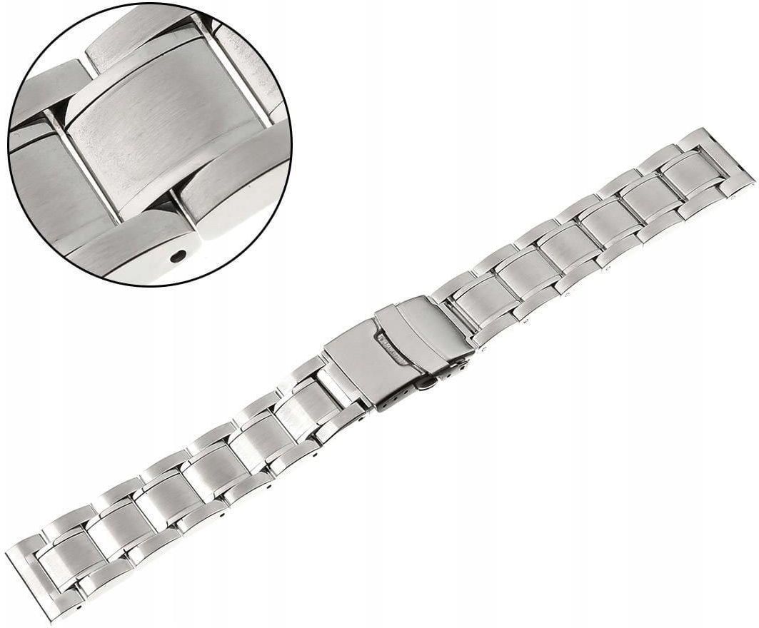 Pasek / Bransoleta: Rodzaj - BRANSOLETA Materiał - STAL NIERDZEWNA Kolor - SREBRNY Mocowanie - UNIWERSALNE Zapięcie: Rodzaj - PÓŁMOTYLKOWE Materiał - STAL NIERDZEWNA Kolor - SREBRNY Szerokość: przy mocowaniu - 20mm przy klamerce - 18mm Długość: maksymalna - 190mm* *Zaokrąglenie pomiarów ( 5mm)