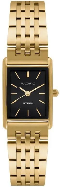 Mechanizm: Typ - KWARCOWY - Mechanizm zasilany baterią srebrową, Koperta: Materiał - STAL NIERDZEWNA, Kształt - PROSTOKĄTNY, Kolor - ZŁOTY Wymiary - SZEROKOŚĆ 20mm / WYSOKOŚĆ 25mm / GRUBOŚĆ 8mm, Wodoszczelność - 30M / 3ATM, Szkło - MINERALNE - niska odporność na zarysowania, Tarcza: Typ - ANALOGOWY - wskazówkowa forma prezentacji czasu, Kolor - CZARNY, Indeksy - w kolorze ZŁOTYM, Wskazówki - w kolorze ZŁOTYM, Pasek / Bransoleta: Typ - BRANSOLETA, Materiał - STAL NIERDZEWNA, Kolor - ZŁOTY, Szerokość przy mocowaniu - 18mm Szerokość przy zapięciu - 18mm Maksymalny obwód - 19cm Funkcje: BRAK. Informacje ogólne: Pochodzenie marki - POLSKA Przy zakupie otrzymujesz: oryginalny zegarek PACIFIC, firmowe opakowanie PACIFIC, kartę gwarancyjną producenta.