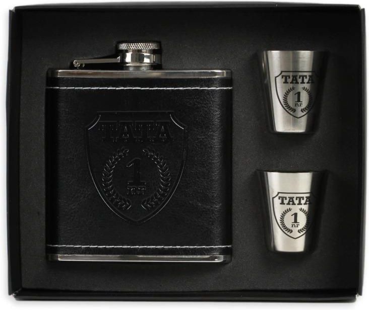 - piersiówka z kieliszkami z limitowanej kolekcji Dnia Taty - w zestawie znajdują się dwa srebrne kieliszki - posiada szczelne zakręcane zamknięcie - produkt zapakowany w ozdobne pudełko - materiał: poliuretan (PU), metal, stal nierdzewna - pojemność piersiówki: 177 ml - pojemność kieliszków: 30 ml - wymiary piersiówki ( wysokość x szerokość x głębokość ):11 x 9,5 x 2 cm - wymiary kieliszka ( wysokość x szerokość x głębokość ): 4 x 3,7 x 4 cm - kolor: czarny, srebrny