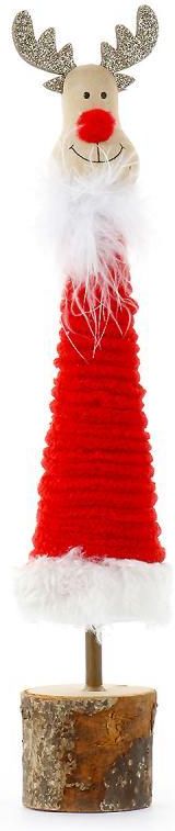 - renifer na drewnianej podstawce - złote, brokatowe poroże - puszek wokół szyi i futerko na dole stroju - czerwona gwiazdka z przodu - materiał: dolomit - wymiary (wysokość x szerokość x głębokość): 27 x 5 x 5 cm