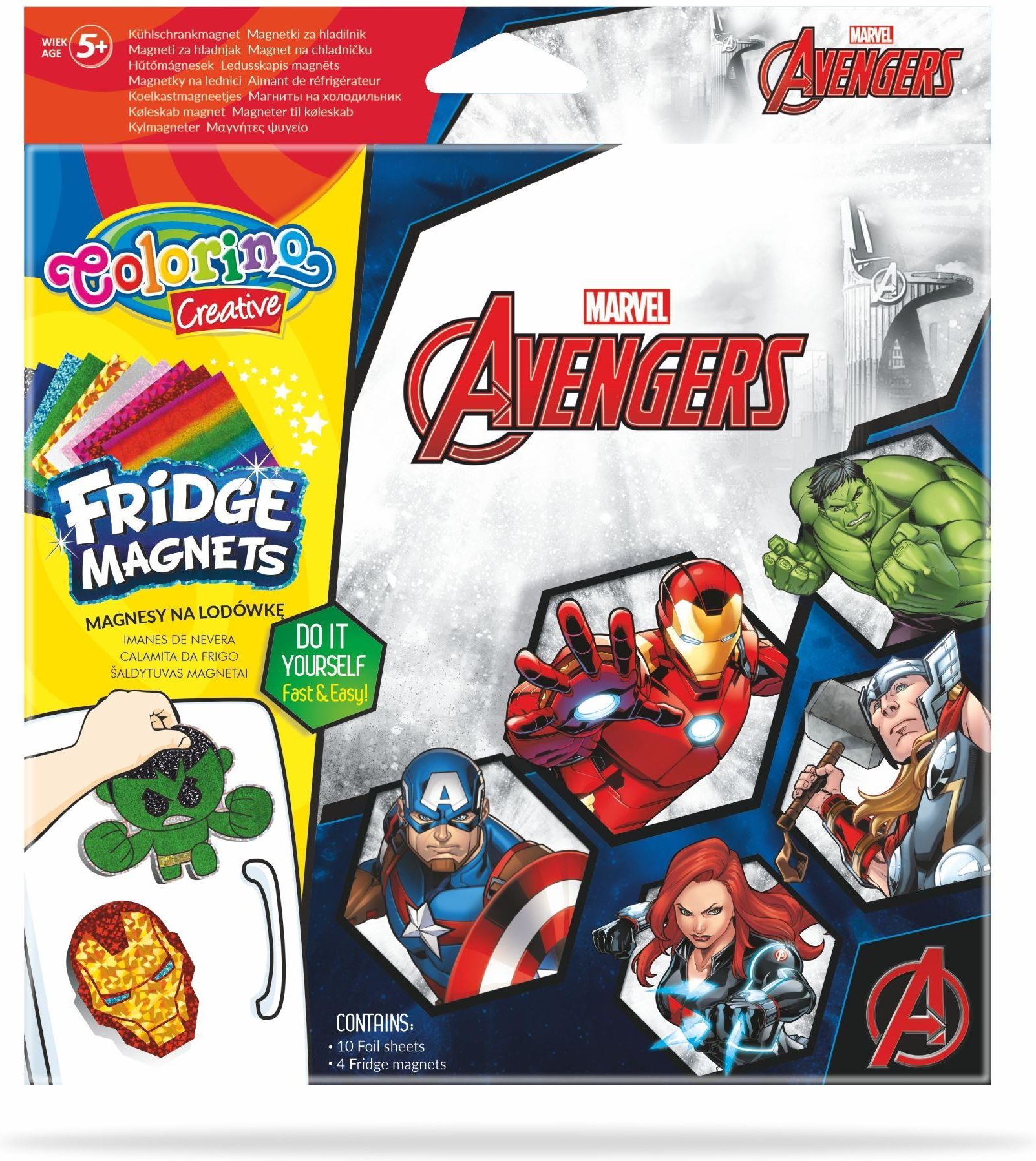 Colorino Magnesy na lodówkę Avengers Magnesy na lodówkę Colorino Avengers to gwarancja niezapomnianej zabawy. Dzieci uwielbiają tworzyć, a kiedy swoje dzieło można wyeksponować w najbardziej ruchliwym miejscu w domu to jest już pełen sukces. Zestaw zawiera cztery różne wzory magnesów przygotowanych do barwnego wyklejania. Wystarczy ściągnąć ochronny papierek przyklejony do magnesu i w to miejsce przyłożyć niezafoliowaną stroną wybrany spośród załączonych kwadracików kolor. Mnóstwo różnych możliwości i kombinacji wyklejania. W każdej serii są dwa różne zestawy figurek magnesowych. Magnesy na lodówkę 4 różne kształty zestaw kolorowych folii wymiary opakowania: 19x21 cm instrukcja: usuń biały papier z magnesu połóż folię (kolorową częścią do góry) na magnes z warstwą kleju dociśnij folię do magnesu usuń pozostałą folię powtórz czynności z pozostałymi kolorami Do wyboru dwie wersje *A i *Iron Man :