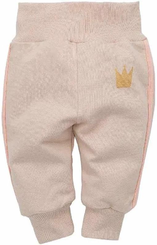 Wygodne, przyjemne spodnie w kolorze ciepłego beżu, wykonane ze 100% bawełny. Różowe paski po bokach ubranka wprowadzają miłe urozmaicenie w kolorystyce, a charakteru dopełnia nadruk złotej korony na jednym bioderku, wykonany metodą bezpiecznych farb wodnych. Szerokie ściągacze w pasie i na nóżkach zapewniają odpowiednie przyleganie, jednocześnie nie krępując ruchu dziecka i nie powodując u niego poczucia dyskomfortu. Dostępne w rozmiarach 62 – 98, od rozmiaru 74 wzmocnione gumką w pasie. Wyprodukowano w Polsce