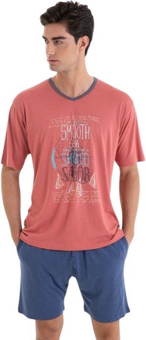 Męska piżama Skilled Sailor z mieszanki dzianiny bawełnianej oraz wiskozy, składająca się z koszulki z nadrukiem marynistycznym z przodu, krótkimi rękawami, dekoltem typu V z kontrastowym obszyciem, do którego kolorystycznie pasują spodenki. Taka kompozycja dodaje dynamizmu. Solidne granatowe szorty z troczkiem w pasie idealnie dopełniają zestaw, oferując elegancki, a jednocześnie swobodny wygląd. Wykonana z miękkiej bawełny piżama zapewnia wygodę i oddychalność, dzięki czemu idealnie nadaje się na spokojne noce i relaksujące poranki.Niezbędnik dla entuzjastów stylu marynistycznego! Piżama jest wyjątkowo delikatna i przyjemna w dotyku. Idealnie dopasowuje się do ciała, jest przewiewna i doskonała na letnie noce. Doskonały pomysł na prezent!!! Skład 50% bawełna 50%wiskoza Kolor: odcienie czerwieni, granatowy Od momentu swojego powstania w 1958 roku, marka MASSANA specjalizuje się w projektowaniu, produkcji i sprzedaży piżam, szlafroków oraz wysokiej jakości odzieży tekstylnej. Firma nieustannie się rozwija i obecnie zajmuje pozycję nie tylko jako lider na hiszpańskim rynku tekstylnym, ale także jako wzór do naśladowania w branży. MASSANA stawia na wysokie standardy jakości, obsługi oraz nowoczesne wzornictwo. Jej celem jest promowanie marki, która wyróżnia się osobowością i charyzmą, a także zapewnienie optymalnej równowagi między modą, jakością a ceną. Zalecenia Prać w 30 ° Nie prać chemicznie Nie wybielać Nie suszyć w suszarce Prasować w temp max. 110 °