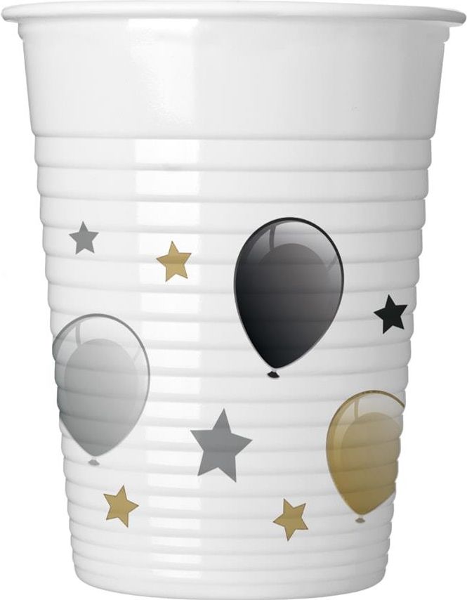 Plastikowe kubeczki w złote, srebrne i czarne gwiazdki oraz baloniki! Świetny dodatek na przyjęcie na każdą okazję. Zestaw zawiera 8 kubeczków o pojemności 200 ml. balonik,biały,gwiazdy i gwiazdeczki,Kolekcja Procos - 18 Milestone,Procos,złoty