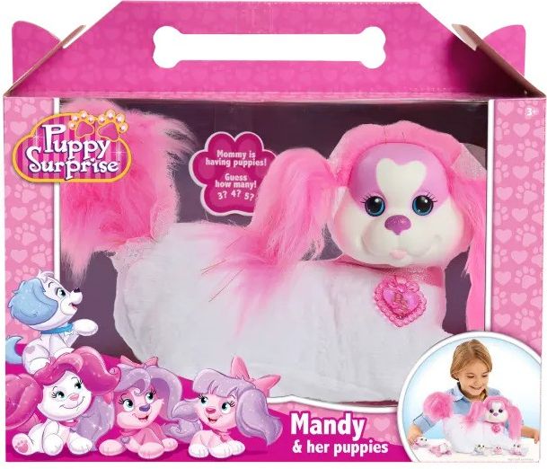 Puppy Surprise - to słodkie, zwierzęce mamy, które skrywają w sobie małe niespodzianki!. Każda mama ma w swoim miocie zaskakującą liczbę maluszków - trzy, cztery lub pięć! Każda pluszowa Puppy Surprise jest wykonana z miękkich tkanin i pięknych detali. Idealne do pielęgnacji, opieki zabawy i przytulania! Psia mama o imieniu Mandy. W jej miocie pojawia się zaskakująca liczba szczeniąt - trzy, cztery lub nawet pięć!