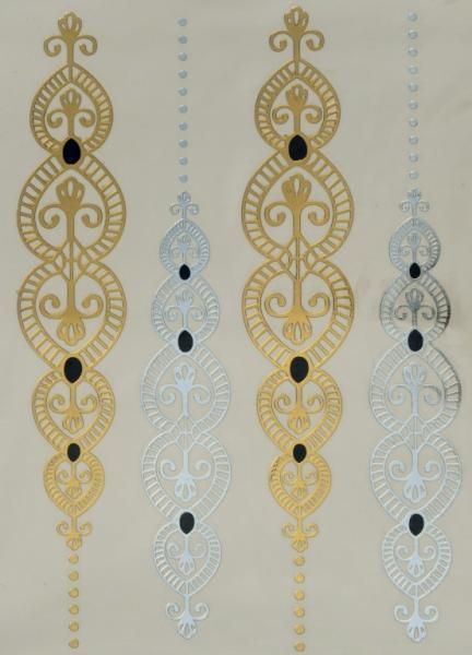 Kolekcja: LEA Wzór: L5 Kolekcja LEA–to zestawy biżuterii w stylu orientalnym. Metaliczne tatuaże - hit nadchodzącego lata 2015! Są bardzo proste w użyciu. Stanowią wspaniały pomysł na stworzenie unikalnego zestawu biżuterii na każdą okazję. Są idealnym dodatkiem do letnich stylizacji, imprez okolicznościowych , karnawałowych czy sylwestrowych. Metaliczne tatuaże są wodoodporne i nie wchodzą w reakcje ze skórą, nie zawierają żadnych substancji toksycznych. Dobrze wykonany tatuaż utrzymuje się na ciele 5-6 dni (z wyjątkiem miejsc podatnych na zginanie lub w przypadku częstego kontaktu z wodą). Sposób aplikacji: Nakładanie tatuażu jest bardzo proste. Wystarczy wybrany motyw tatuażu przyłożyć do suchej skóry, a następnie nawilżyć go wilgotną gąbką, przycisnąć delikatnie do ciała i odczekać 30-40 sekund. Następnie delikatnie oderwać papierowy podkład i tatuaż gotowy! Wymiary arkusza: 15x24cm.