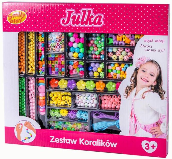 SMILY PLAY Zestaw koralików Julka Zestaw koralików Zestaw kolorowych koralików, dzięki któremu mała dziewczynka samodzielnie będzie mogła zaplanować, stworzyć i użytkować własną biżuterię. Z koralików powstają łańcuszki, zawieszki, kolczyki, bransoletki, naszyjniki, pierścionki. Spersonalizowana …