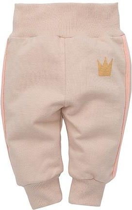 Wygodne, przyjemne spodnie w kolorze ciepłego beżu, wykonane ze 100% bawełny. Różowe paski po bokach ubranka wprowadzają miłe urozmaicenie w kolorystyce, a charakteru dopełnia nadruk złotej korony na jednym bioderku, wykonany metodą bezpiecznych farb wodnych. Szerokie ściągacze w pasie i na nóżkach zapewniają odpowiednie przyleganie, jednocześnie nie krępując ruchu dziecka i nie powodując u niego poczucia dyskomfortu. Dostępne w rozmiarach 62 – 98, od rozmiaru 74 wzmocnione gumką w pasie. Wyprodukowano w Polsce