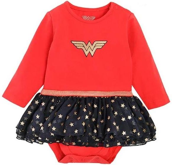 Komplet dla dziewczynki: - kolor: czerwony - licencja: Wonder Woman Body sukienka z długim rękawem: - 95% bawełna, 5% elastan (gramatura 240 g/m2) - doszyta granatowa, tiulowa spódniczka w złote gwiazdki - brokatowe zdobienia - napy w kroku i na ramieniu