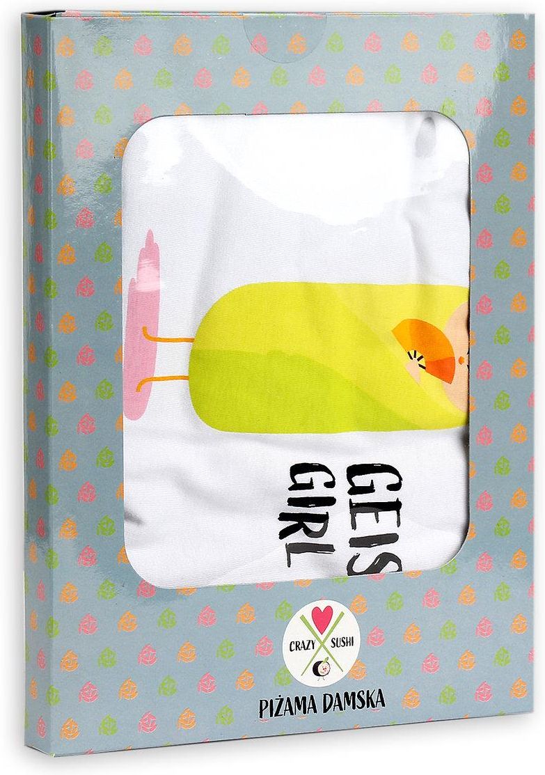 Crazy Sushi, to kolorowa kolekcja gadżetów z zabawnymi grafikami i tekstami, utrzymanymi w tematyce sushi właśnie. Koszulka „Fishionista” czy bokserki „Miso horny” z pewnością znajdą swoich fanów, nie tylko wśród miłośników japońskiej kuchni. Bambusowa miska i lunchbox oraz kubek to doskonały pomysł na urozmaicenie obiadu w pracy lub szkole. W kolekcji znajdują się również piżamy dla każdej Geisha Girl, torby, przypinki czy breloki. - piżama damska z limitowanej kolekcji Crazy Sushi - koszulka z przodu ozdobiona grafiką oraz napisem: "GEISHA GIRL", tył gładki - spodnie z motywem plamek z kolorowych kresek, zakończone ściągaczem - rozmiar: M - materiał: 100% bawełna - prać w temperaturze 30°C, nie wybielać, nie suszyć w suszarce, prasować w niskich temperaturach, nie czyścić chemicznie