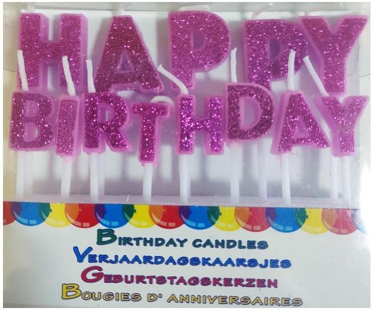 - Świeczki tortowe. - Różowe brokatowe - Tworzą napis Happy Birthday - Wysokość: 6 cm