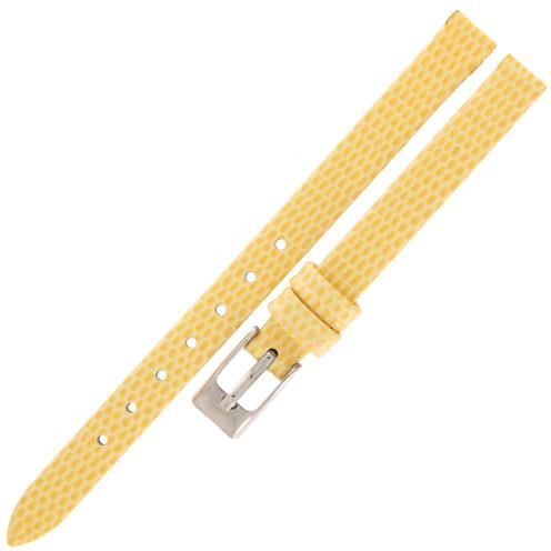 Pasek / Bransoleta: Rodzaj - PASEK Materiał - SKÓRA CIELĘCA Struktura - JASZCZURKA Kolor - ŻÓŁTY Mocowanie - UNIWERSALNE Zapięcie: Rodzaj - KLAMERKA Materiał - STAL NIERDZEWNA Kolor - SREBRNY Szerokość: przy mocowaniu - 8mm przy klamerce - 8mm Długość: część z klamerką - 60mm* część z dziurkami - …