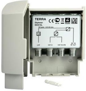 Zwrotnica DC015L VHFI/II+FM-VHFIII-UHF Terra Kod towaru: DC015L Zwrotnica antenowa DC-015L z 3 wejściami stosowana jest jako element sumujący sygnały z 3 anten (sygnały pasma FM+VHFI/II (47...108 MHz), VHFIII (174...230 MHz) oraz pasma UHF (470...790 MHz)), montowana jest na maszcie antenowym, w …