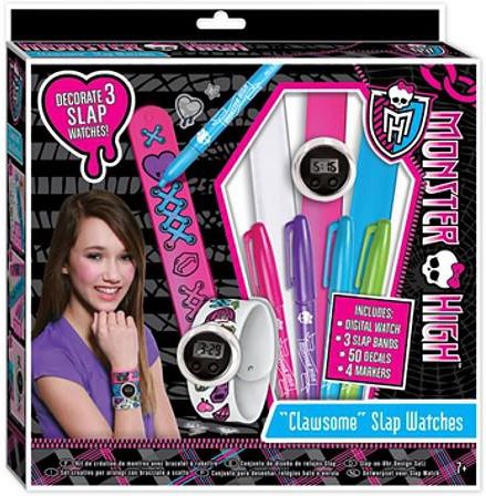 Fantastyczny zestaw dla każdej fanki upiorków z "Monster High". Dzięki niemu możesz stworzyć wyjątkowy zegarek aż w 3 odsłonach! Wolisz bransoletki? Nic prostszego, możesz zaprojektować aż trzy! W zestawie wiele akcesoriów, dzięki którym Twoje ozdoby na rękę będą upiornie niepowtarzalne! Znajdziesz w nim: Tarczę eleketroniczną zegarka - tarcza jest okrągła, wsuwana na bransoletkę, dzięki czemu można ją zdjąć w każdej chwili. Tarcza jest na baterkę LR 4 (w zestawie). Trzy fantastyczne bransoletki - w kolorach Monster High: biały, różowy i niebieski. Są plastikowe, łatwo się zginają i dostosowują do dłoni. Odpowiednia grubość pozwala na umieszczenie na nich naklejek (w zestawie) Cztery straszystyczne pisaki do kolorowania: różowy, fioletowy, niebieski i zielony, każdy z logo Monster High. Aż 50 naklejek - możesz mini okleić bransoletki oraz wszystkie gadżety, które będziesz chciała. Naklejki można pokolorować. Znajdziesz wśród nich Monster-czaszki, agrafki, Frankie-pioruny, Draculaura-zęby, trumienki i inne fantastyczne wzory. Instrukcję z podpowiedziami, jak stylowo udekolorwać zegarek. Wspaniały, kreatywny zestaw będzie idealnym prezentem dla każdej wielbicielki mody i Monster High. Rozwija wyobraźnię, zręczność, zmysł estetyczny i nie tylko.
