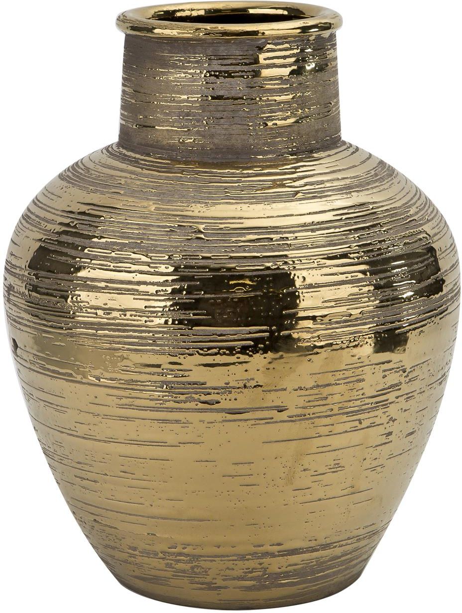 Czarujący i bardzo efektowny wazon ceramiczny złoty. Stanowi doskonały element dekoracji wnętrz. Może być ozdobą zarówno z kwiatami sztucznymi jak i bez nich. Prezentuje się niesamowicie. Wazon jest ważnym elementem dekoracji wnętrz. Niezależnie od stylu, jaki panuje w domu, ten produkt zawsze znajdzie swoje miejsce i zastosowanie. Wazon dekoruje nie tylko stół, ale także półki ścienne, okna i inne meble (komody, witryny itp.) Ten nietuzinkowy przedmiot jest sprawdzonym pomysłem na prezent. Doskonale sprawdza się jako upominek dla nowożeńców czy na parapetówkę do nowo urządzonego domu, czy mieszkania.