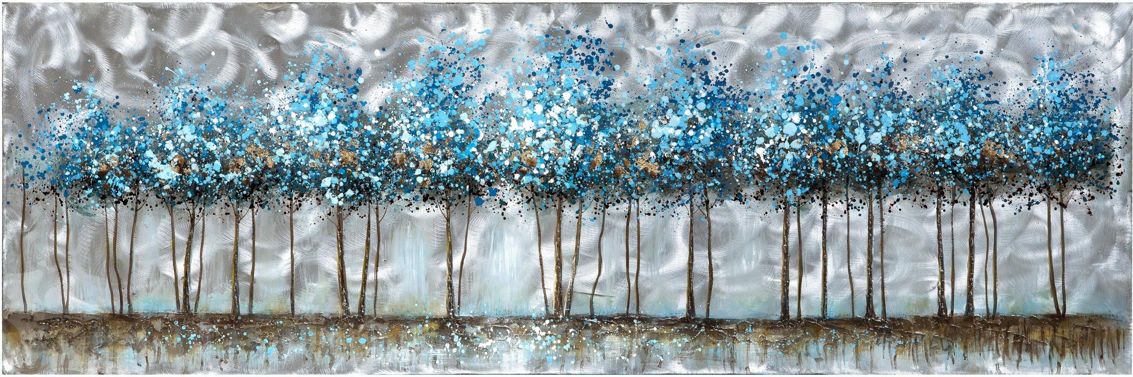 Piękny obraz ścienny ręcznie malowany, który przedstawia szereg cudownie ubarwionych drzew na tle szarości i srebra. Obraz malowany jest na płótnie i pokryty werniksem. Sprawia to, że obraz nabiera połysku. Drzewa stanowią nieograniczone źródło artystycznych inspiracji. Zarówno kolorowe, jak i czarno-białe fotografie oraz nowoczesne obrazy drzew, ukazujące rozłożyste konary czy smukłe sylwetki, doskonale uzupełnią każdą aranżację wnętrza. Wprowadzą do Twojego domu element spokoju, równowagi i harmonii. Poczuj moc majestatycznych drzew oraz kojącą atmosferę barw w odcieniach błękitu, srebra czy szarości. Odkryj, jak modny obraz niebieskich drzew może odmienić Twoje wnętrze. Wyobraź sobie, że ten jeden z najpiękniejszych krajobrazów będzie towarzyszyć Ci przez długi czas, dodając elegancji i charakteru Twojemu salonowi lub sypialni. Zachęcamy do zapoznania się z całą kolekcją naszych obrazów, w której znajdziesz najpiękniejsze malowidła, idealne do wyeksponowania w Twoim wnętrzu.Obrazy pokryte są werniksem zabezpieczającym jego powierzchnię, co wpływa na trwałość obrazu, a także dodaje mu walorów wizualnych: pogłębia ton i nadaje połysk. Malowane są farbą olejną na płótnie, z wykorzystaniem różnorodnych technik malarskich. Obraz ręcznie malowany na płótnie nigdy nie wyjdzie taki sam. Jest to zaleta i gwarancja oryginalności. Inne zalety to widoczna faktura farby, odpowiednie krosno i niepowtarzalny charakter. Pokryty jest werniksem, który zabezpieczają jego powierzchnię, co wpływa na trwałość obrazu, a także dodaje mu walorów wizualnych: pogłębia ton i nadaje połysk.