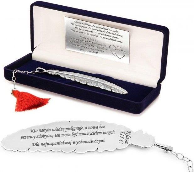 Srebrna zawieszka piórko z chwostem grawerowanaZ pewnością zwróciła Twoją uwagę ta jedyna w swoim rodzaju srebrna zakładka do książki w kształcie pióra. Wierzymy, że dzięki niej czytanie sprawia jeszcze więcej przyjemności. Elegancka, błyszcząca, zakończona łańcuszkiem z delikatną zawieszką. Nie tylko pięknie się prezentuje, ale również nie niszczy się tak jak klasyczne papierowe zakładki. Zakładka grawerowana pióro to oczywiście wspaniały i zaskakujący pomysł na elegancki prezent praktycznie na każdą okazję. Z tyłu można wygrawerować dowolny napis, dedykację, co jeszcze bardziej podkreśla jej wyjątkowość. Ucieszy w szczególności miłośnika książek, a także każdego, kto ceni eleganckie i ponadczasowe drobiazgi. Zastanów się, jaki grawer chcesz umieścić na piórze i wyślij do nas zamówienie.Dane do grawerowania można przesłać w osobnym mailu bądź w wiadomości dla sprzedającego podczas składania zamówienia.Parametry zakładki:Szerokość: 2 cmDługość (bez łańcuszka): 10 cmDługość całkowita (z łańcuszkiem i chwostem): 20 cmWaga: 15gKolor chwosta prześlij po zakupie - dostępne kolory niebieski i czerwony - inne kolory dostępne po wcześniejszym kontakcieZakładka jest niepowtarzalnym, polskim produktem, który powstaje w naszej pracowni złotniczej. Cechowana jest zgodnie z Polskim Prawem Probierczym w UP w Warszawie.Zarówno grawerowanie na zakładce jak i dedykacji na etui jest GRATIS!W cenie produktu otrzymujecie Państwo:Srebrną zakładkę do książki z wybitą próbą 925Certyfikat autentyczności do produktuIndywidualny grawer na zakładceEleganckie etui w kolorze granatowym lub bordowymIndywidualną dedykację do etuiDowód zakupu w postaci paragonu lub fakturyMetkę do produktu z jego wagą i próbą100% Polski wyrób cechowany zgodnie z Polskim Prawem ProbierczymObsługę klienta na najwyższym poziomieEtui i dedykacjaW cenie produktu otrzymujecie Państwo również etui oraz możliwość wygrawerowania dedykacji. Dostępne czcionki wraz z dostępnymi symbolami do grawerowania na dedykacji znajdują się poniżej.Srebrna zakładka do książki nieprzypadkowo znalazła się w ofercie naszej Pracowni. Postanowiliśmy wzbogacić asortyment o oryginalne wyroby, a elegancka zakładka z grawerem jest tylko jednym z nich. Prezentujemy produkt stworzony z myślą o osobach, kochających spędzać czas z książką w ręku. Dzięki grawerowanej dedykacji, zakładka do książki srebrna perfekcyjnie nadaje się na prezent – na przykład na Dzień Babci lub Dzień Nauczyciela. W tej kategorii na miłośników praktycznych upominków czeka srebrna zakładka w kształcie piórka, zakończonego modną zawieszką, umieszczoną na łańcuszku. Czerwony chwost to atrakcyjna ozdoba, nadająca całości niebanalnego wyglądu. Zakładkę sprzedajemy w bordowym lub granatowym etui (do wyboru), wewnątrz którego przewidzieliśmy miejsce na dedykację. Grawer możemy umieścić także bezpośrednio na zakładce, czyniąc z niej oryginalny, personalizowany gadżet.W tej kolekcji znalazła się srebrna zakładka do książki z indywidualną dedykacją. Zamów teraz!Historia zakładek książkowych sięga setek lat wstecz. Przez ten czas tradycyjne zakładki ewoluowały, przybierając coraz ciekawsze formy. Wyróżniamy zakładki papierowe, silikonowe, magnetyczne, z latarką... Prawdziwą furorę robią jednak pięknie wykonane modele ze szlachetnych materiałów. W przeciwieństwie do zwykłych wyrobów o niskiej trwałości, te cechują się doskonałą jakością i są gadżetem, który przetrwa długie lata w niezmienionym kształcie. Zakładka do książki srebrna będzie trafionym wyborem na upominek dla kogoś, kto ceni sobie wysublimowany styl i lubi czytać. Nie dość, że znakomicie się zaprezentuje, nie pozwoli zapomnieć, na której stronie skończyliśmy lekturę. Co więcej, zakładka do książki z grawerem uchroni egzemplarz przed zniszczeniem – czytelnik nie będzie musiał zaginać rogów stron ani pozostawać otwartej książki grzbietem do góry. W Pracowni Złotniczej Markiza zajmujemy się tworzeniem grawerowanych wyrobów okazjonalnych i biżuteryjnych z wyselekcjonowanych surowców. Działamy w branży już od ponad 20 lat, cały czas rozwijając swoje umiejętności. Z satysfakcją odkrywamy więc nowość, która zainteresuje wszystkich pasjonatów czytania: oto srebrna zakładka do książki z grawerem. O wyglądzie ozdoby decyduje Zamawiający – jako Klient masz możliwość wyboru dowolnej personalizacji, w tym tekstu oraz grafiki. Ozdobimy trwałym grawerem pudełko oraz samą zakładkę, nanosząc na srebro dokładnie taki napis, jaki wybierzesz. Serdecznie zapraszamy na przegląd oferty, w której kryje się zakładka srebrna do książki w unikalnym kształcie piórka z ozdobnym chwostem....