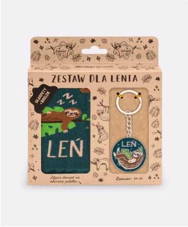 Skarpety: Skład: 80% najwyższej jakości bawełna czesana, 17% poliamid (dodaje wytrzymałości), 3% elastan (skarpetka lepiej dopasowuje się do stopy) Nieuciskający ściągacz i komfortowy płaski szew na palcach Wyprodukowano w Polsce Prać zawsze na lewej stronie w temperaturze maks. 40° C, nie prasować. Brelok z zawieszką do kluczy: Średnica: 4 cm Wykonany z metalu, pokryty emalią Wyprodukowano w Polsce Zestaw: Wymiary pudełka 15,5 cm x 3 cm x 17,5 cm Idealny prezent dla zdolnych, acz leniwych