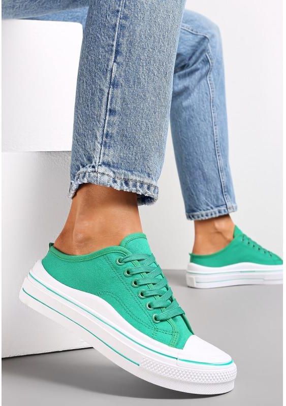 Casulowe trampki w modnym designie, idealne do looku street. - Kolor: Zielony - Tęgość stopy: Wąski - Rodzaj obcasa: Płaski - Wkładka/wyściółka: Materiał włókienniczy - Materiał: Guma - Nosek buta: Okrągły - Zapięcie: Sznurowanie - Sezon: Wiosna, Lato, Jesień - Wysokość obcasa: 3cm