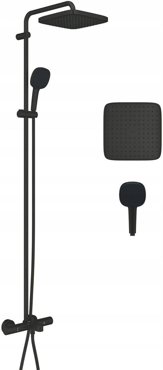 Grohe Vitalo Comfort 250 269842431 Zestaw GROHE Vitalo Comfort 250 to kluczowy element wyposażenia łazienki, który znacząco wpływa na codzienny komfort użytkowania. Dzięki połączeniu nowoczesnego designu z innowacyjnymi rozwiązaniami, ten zestaw prysznicowy zapewnia nie tylko relaksującą kąpiel, ale także spełnia wszystkie potrzeby związane z higieną. Oto szczegółowe informacje o jego kluczowych cechach. Wymiary i regulacja Zestaw charakteryzuje się poziomym obrotowym ramieniem o długości 390 mm oraz deszczownicą o średnicy 250 mm, co zapewnia szeroki strumień wody. Dzięki regulowanemu uchwytowi prysznica oraz możliwości obrotu deszczownicy (± 10°), każdy użytkownik może dostosować zestaw do swoich indywidualnych potrzeb. Długość węża oprysznicowego wynosi 1750 mm, co zapewnia dużą wygodę w trakcie korzystania. Materiał wykonania i wykończenie GROHE Vitalo Comfort 250 jest wykonany z wysokiej jakości materiałów, takich jak stal nierdzewna i mosiądz, co zapewnia trwałość oraz odporność na korozję. Czarne matowe wykończenie nadaje elegancki i nowoczesny wygląd, który doskonale wpisuje się w aktualne trendy w aranżacji wnętrz. Dodatkowo, zastosowanie technologii SpeedClean ułatwia utrzymanie czystości, co jest istotnym atutem dla użytkowników. Rodzaj montażu i kompatybilność Zestaw jest montowany natynkowo, co oznacza, że jego instalacja jest szybka i prosta. Dzięki standardowym wymiarom, zestaw jest kompatybilny z większością istniejących systemów wodnych, co czyni go idealnym rozwiązaniem do różnych łazienek. Funkcje dodatkowe Zestaw oferuje szereg innowacyjnych funkcji, które zwiększają komfort użytkowania. Oto najważniejsze z nich: termostat z funkcją Aquadimmer – umożliwia łatwe przełączanie między deszczownicą a prysznicem ręcznym, oszczędzanie wody – technologia Grohe Water Saving pozwala na zmniejszenie zużycia wody bez utraty komfortu, Grohe TurboStat – zapewnia stabilną temperaturę wody podczas całego prysznica, blokada SafeStop na 38°C – chroni przed przypadkowym poparzeniem, co jest ważne w domach z dziećmi, intuicyjny przełącznik SmartSwitch – ułatwia wybór preferowanego strumienia wody, system ShockProof – chroni słuchawkę prysznicową przed uszkodzeniami w przypadku upadku, TwistStop – zapobiega skręcaniu węża, co zwiększa wygodę korzystania. Rodzaje strumienia wody Zestaw prysznicowy oferuje różnorodne rodzaje strumienia, co pozwala na dostosowanie doznań do indywidualnych preferencji: deszczowy (Rain) – idealny do relaksujących kąpieli, masażujący (Jet) – doskonały do pobudzenia ciała i umysłu, mgiełka – dla delikatnych pryszniców, strumień normalny – uniwersalny i funkcjonalny. Wyposażenie i przeznaczenie Zestaw jest wyposażony w baterię, co czyni go kompletnym rozwiązaniem do każdej łazienki. Jest przeznaczony do użytku domowego, co sprawia, że idealnie sprawdzi się w codziennym użytkowaniu, a jego nowoczesne rozwiązania są odpowiednie dla rodzin z dziećmi. Dzięki eleganckiemu wyglądowi, funkcjonalności oraz łatwości w utrzymaniu czystości, zestaw GROHE Vitalo Comfort 250 to doskonały wybór dla osób poszukujących wysokiej jakości w swojej łazience.