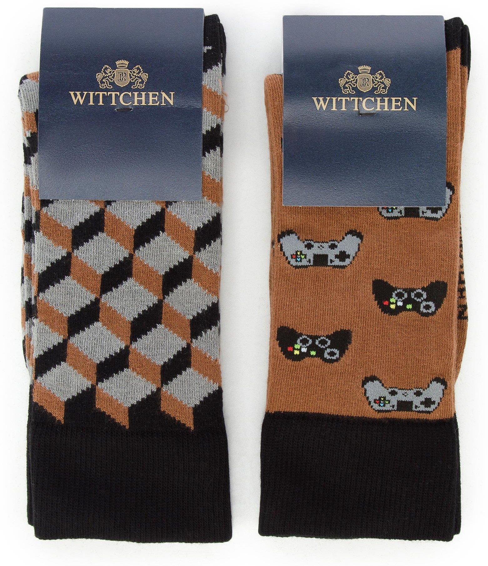 Skarpetki męskie wzorzyste. Ten wyjątkowy zestaw męskich skarpetek to doskonały wybór dla mężczyzny lubiącego tematyczne dodatki. W opakowaniu znajdują się dwie różne pary: w trójwymiarowy, geometryczny wzór oraz w wyszyte pady – idealne dla miłośnika gier. Skarpetki wykonane zostały z przyjemnej w dotyku bawełny z dodatkiem włókien poprawiających elastyczność. Zestaw męskich skarpetek w nowoczesny wzór doda charakteru do każdego Twojego stroju.Nasza rada: skarpetki zapakowane są w eleganckie pudełko, więc świetnie nadają się na prezent dla miłośnika gier. 78% bawełna, 14% poliamid, 4% polipropylen, 2% elastodien, 2% elastan; wyprodukowane w Polsce; sięgają nad kostkę; zapakowane w eleganckie pudełko; pranie w pralce do 40 st. C.