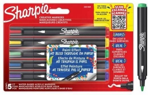 Markery artystyczne Sharpie z farbą akrylową | Farba na bazie wody | Nie przeciekający tusz umożliwia pisanie na większości powierzchni | Końcówka stożkowa | Różne kolory | 5 sztuk Wymiary: 201x141 mm Opakowanie: blister