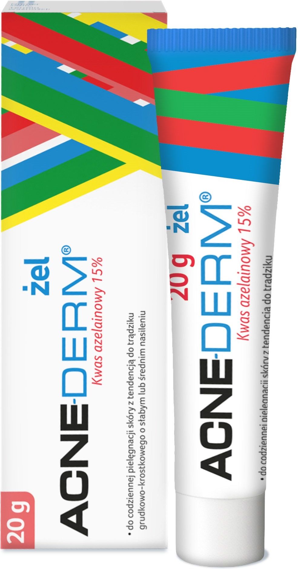 ACNE-DERM, żel przeciwtrądzikowy i wybielający z kwasem azelainowym 15%, do codziennej pielęgnacji skóry z tendencją do trądziku grudkowo-krostkowego, na trądzik, na zaskórniki, na przebarwienia, 20 g ACNE/2/02/2026 SZCZEGÓŁY PRODUKTU: Opis produktu Zastosowanie Ważne informacje Składniki Co to jest żel ACNE-DERM i w jakim celu się ją stosuje? ACNE-DERM to żel przeciwtrądzikowy i wybielający z kwasem azelainowym 15% do codziennej pielęgnacji skóry z tendencją do trądziku grudkowo-krostkowego o słabym lub średnim nasileniu u młodzieży od 12 lat i dorosłych. Składniki zawarte w żelu zmniejszają stany zapalne oraz pozapalne przebarwienia potrądzikowe (świeże i utrwalone), redukują rumień. Kwas azelainowy zawarty w żelu ACNE-DERM działa przeciwbakteryjnie, szczególnie na bakterie Propionibacterium acnes, które mają wpływ na rozwój trądziku. Ponadto kwas azelainowy zmniejsza liczbę mikrozaskórników, w wyniku normalizacji procesu powstawania keratyny oraz hamowania nadmiernego rogowacenia naskórka.  Dlaczego warto stosować żel ACNE-DERM z kwasem azelainowym? Kwas azelainowy 15% ma: Działanie przeciwtrądzikowe – działa przeciwbakteryjnie, szczególnie na bakterie Propionibacterium acnes, które mają wpływ na rozwój trądziku. Ponadto kwas azelainowy zmniejsza liczbę mikrozaskórników, w wyniku normalizacji procesu powstawania keratyny oraz hamowania nadmiernego rogowacenia naskórka. Działanie wybielające – dzięki zdolności hamowania aktywności tyrozynazy oraz enzymów mitochondrialnych, hamuje wzrost i nadczynność komórek barwnikowych skóry (melanocytów). .table-container { overflow-x: auto; margin: 20px auto; background-color: #fff; border: 1px solid #ddd; box-shadow: 0 2px 5px rgba(0, 0, 0, 0.1); } .responsive-table { width: 100%; border-collapse: collapse; } .responsive-table thead { background-color:#b5e2ee; } .responsive-table th, .responsive-table td { padding: 12px 15px; text-align: center; border: 1px solid #a7e1ec; font-size:20px; } .responsive-table th { font-weight: bold; background: #b5e2ee; } @media screen and (max-width: 600px) { .responsive-table th, .responsive-table td { font-size: 18px; padding: 10px; } } Jak stosować żel ACNE-DERM – sposób użycia Stosować 2 razy dziennie (rano i wieczorem) miejscowo na dokładnie umytą i osuszoną skórę. Żel należy delikatnie wetrzeć lub wklepać. Przy pojedynczych wypryskach stosować punktowo. W razie konieczności równoczesnego stosowania innych preparatów na skórę, zaleca się stosować je między kolejnymi podaniami (aplikacjami) żelu ACNE-DERM. Podczas nakładania żelu należy chronić oczy, usta oraz błony śluzowe. Po nałożeniu żelu należy dokładnie umyć ręce. Pasek o długości 2,5 cm (ok. 0,5 g żelu) wystarcza na pokrycie skóry twarzy. Osoby ze skórą wrażliwą przez pierwszy tydzień stosowania żelu ACNE-DERM powinny stosować żel tylko raz na dobę – wieczorem. W przypadku podrażnienia skóry należy zmniejszyć ilość nakładanego żelu lub stosować go raz na dobę, do czasu ustąpienia objawów podrażnienia. Jeśli to konieczne, należy przerwać stosowanie żelu na kilka dni Działania niepożądane: Na początku stosowania żelu ANE-DERM mogą wystąpić: miejscowe podrażnienia skóry, świąd, uczucie pieczenia, zaczerwienienie i łuszczenie skóry. Jeśli objawy utrzymują się, żel należy stosować raz na dobę. Rzadko może wystąpić: kontaktowe zapalenie skóry, zapalenie mieszków włosowych, białe plamy lub rozjaśnienie skóry w miejscu stosowania produktu u osób o ciemnej karnacji, reakcje nadwrażliwości na światło, alergiczne reakcje skórne, np. wysypka. W przypadku wystąpienia tych objawów należy przerwać stosowanie żelu. Przeciwwskazania: Nie należy stosować żelu ACNE-DERM w przypadku nadwrażliwości na kwas azelainowy lub pozostałe składniki produktu kosmetycznego. Stosowanie w ciąży i podczas karmienia piersią: Nie należy stosować żelu ACNE-DERM w okresie ciąży i karmienia piersią. Zalecenia i środki ostrożności Tylko do użytku zewnętrznego. Po zastosowaniu żelu należy unikać ekspozycji na promieniowanie słoneczne. Należy stosować jednocześnie kremy z filtrami UVA i UVB, ponieważ promieniowanie słoneczne może nasilać zmiany trądzikowe. Po nałożeniu żelu należy dokładnie umyć ręce. Należy unikać kontaktu produktu z oczami, ustami i błonami śluzowymi. W przypadku kontaktu produktu z oczami, ustami i błonami śluzowymi należy je natychmiast przepłukać dużą ilością wody. Nie stosować u dzieci poniżej 12 lat. Preparat przebadany dermatologicznie. Nie zawiera kompozycji zapachowych. Nie zawiera barwników. Co zawiera żel ACNE-DERM? Składniki: Aqua, Azelaic Acid, Propylene Glycol, Polysorbate 80, Caprylic/Capric Triglyceride, Lecithin, Carbomer, Sodium Hydroxide, Benzoic Acid, Disodium EDTA. Przechowywanie Jak przechowywać żel ACNE-DERM? Przechowywać w miejscu niedostępnym dla dzieci, w temperaturze poniżej 25°C.  Nie stosować po upływie terminu ważności zamieszczonego na opakowaniu. .toggleParagraphs .lnd_button-action { float: none; display: inline-block; margin: 10px; padding: 12px 15px; background: white; font-size: 20px; border-radius: 4px; text-shadow: none; color: white !important; } .toggleParagraphs .lnd_button-action:hover { color: white!important; } .toggleParagraphs .menu__item label, .Menu .menu__item label { cursor: pointer; } .toggleParagraphs .menu__item input:checked+label, .Menu .menu__item input:checked+label { font-weight: bold; } .toggleParagraphs .lnd_object[visibility="hidden"], .lnd_container[visibility="hidden"] { display: none; } .toggleParagraphs .lnd_object-title { display: none; } .lnd_Menu .menu__item__item input:checked+label { display: none; } .lnd_Menu label { display: inherit; } .Menu input { display: none; } .menu__item input:checked~label { padding-top: 70px; padding-bottom: 25px; border-radiu