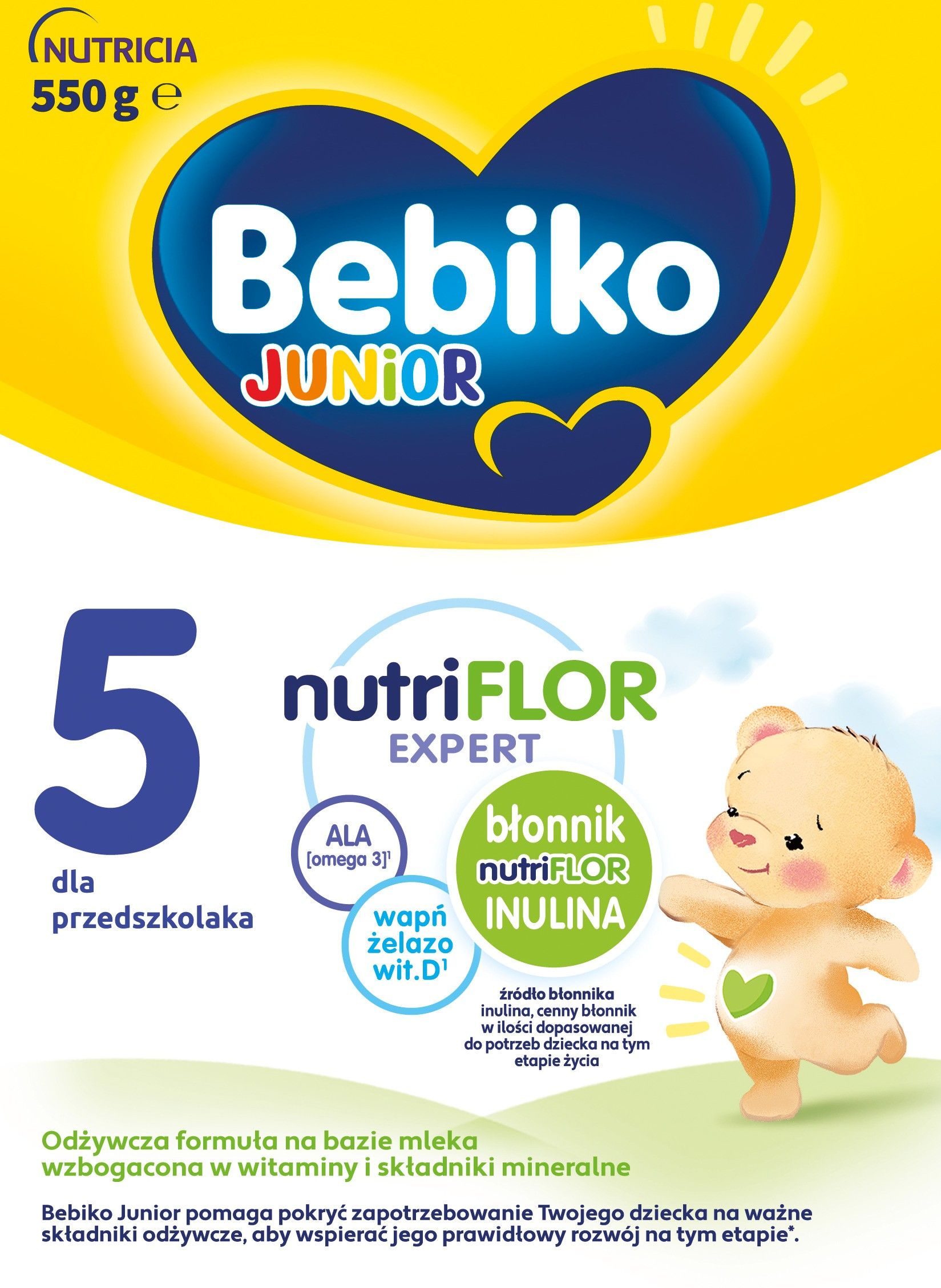 BEBIKO JUNIOR NUTRIflor Expert 5 formuła na bazie mleka dla przedszkolaka 550 g Odżywcza formuła na bazie mleka wzbogacona w witaminy i składniki mineralne Bebiko Junior pomaga pokryć zapotrzebowanie Twojego dziecka na ważne składniki odżywcze, aby wspierać jego prawidłowy rozwój na tym etapie*. Czy wiesz, że Twój Junior potrzebuje aż: - 6x więcej witaminy D - 4x więcej wapnia oraz żelaza niż Ty?³** 2 kubki dziennie Bebiko Junior 5 nutriFLOR Expert to zbilansowana porcja ważnych składników odżywczych, która pokrywa**: 62 % zapotrzebowania na witaminę D 67 % zapotrzebowania na jod 72 % zapotrzebowania na wapń 74 % zapotrzebowania na żelazo Warto pamiętać: podając Bebiko Junior swojemu maluchowi dostarczysz mu znacznie więcej: witaminy D żelaza jodu niż podając mleko krowie. Formuła Bebiko 5 z błonnikiem nutriFLOR Inulina Na wielkie potrzeby małych brzuszków *Kompozycja składników dla wsparcia prawidłowego rozwoju, mocnych kości i zębów oraz układu odpornościowego, w tym: Wit. A¹, C¹ i D¹ dla prawidłowego funkcjonowania układu odpornościowego ALA (omega 3)¹ niezbędny do prawidłowego rozwoju mózgu i tkanki nerwowej⁴ Żelazo¹ i jod¹ wspierające prawidłowy rozwój poznawczy Wapń¹ i wit. D¹ niezbędne dla prawidłowego rozwoju kości i zębów Źródło błonnika - Inulina cenny błonnik w ilości dopasowanej do potrzeb dziecka na tym etapie życia Bez oleju palmowego Bez konserwantów i barwników² Bez wzmacniaczy smaku² Obecnie używasz: Bebiko Junior 5 nutriFLOR Expert Formuła na bazie mleka przeznaczona dla małych dzieci, wzbogacona w witaminy i składniki mineralne, w proszku, do przygotowania napoju. Czy wiesz, że.... Bebiko Junior zawiera znacznie więcej witaminy D, żelaza i jodu niż mleko krowie, składników kluczowych dla prawidłowego rozwoju? **Zgodnie z: Normy żywienia dla populacji Polski pod red. Rychlik E. i wsp. NIZP-PZH, 2024. ¹Tak jak inne produkty przeznaczone dla małych dzieci, ²Zgodnie z przepisami prawa produkty na bazie mleka dla małych dzieci nie zawierają barwników, konserwantów i wzmacniaczy smaku. ³W przeliczeniu na kg masy ciała, ⁴Dla porcji 200 ml. Składniki: laktoza z MLEKA, produkt serwatkowy (odmineralizowana serwatka, koncentrat białek serwatki) w proszku z MLEKA, odtłuszczone MLEKO w proszku (13 %), olej słonecznikowy, inulina (9 %), olej rzepakowy, wapń, aromat naturalny, witamina C, emulgator (lecytyny ze słonecznika), żelazo, przeciwutleniacz (palmitynian L-askorbylu), witamina A, ryboflawina, jod, witamina D, witamina B12 Wartości odżywcze w 100 ml gotowego do spożycia napoju: Wartość energetyczna: 264 / 63 kJ/kcal, Tłuszcz: 2,7 g, w tym, kwasy tłuszczowe nasycone: 0,28 g, kwasy tłuszczowe jednonienasycone: 1,1 g, kwasy tłuszczowe wielonienasycone: 1,19 g, Węglowodany: 8,1 g, w tym, cukry: 8,1 g, Błonnik: 1,1 g, Białko: 1,0 g, Sól: 0,04 g, Witaminy:, Witamina A: 72 μg, Witamina D: 2,32 μg, Witamina C: 7,7 mg, Ryboflawina: 0,14 mg, Witamina B12: 0,24 μg, Składniki mineralne:, Wapń: 126 mg, Żelazo: 1,3 mg, Jod: 15 μg, Inne:, kwas α-linolenowy (ALA): 89,2 mg, *Referencyjna Wartość Spożycia % RWS*: Wartość energetyczna, Tłuszcz, w tym, kwasy tłuszczowe nasycone, kwasy tłuszczowe jednonienasycone, kwasy tłuszczowe wielonienasycone, Węglowodany, w tym, cukry, Błonnik, Białko, Sól, Witaminy:, Witamina A: 9 %, Witamina D: 46 %, Witamina C: 10 %, Ryboflawina: 10 %, Witamina B12: 10 %, Składniki mineralne:, Wapń: 16 %, Żelazo: 9 %, Jod: 10 %, Inne:, kwas α-linolenowy (ALA), *Referencyjna Wartość Spożycia Ważne informacje - Dla zdrowia dziecka ważna jest urozmaicona i zbilansowana dieta oraz zdrowy tryb życia. Zaleca się, aby przejście z karmienia Bebiko 4 nutriFLOR Expert na Bebiko Junior 5 nutriFLOR Expert przeprowadzać stopniowo, zmniejszając ilość proszku Bebiko 4 nutriFLOR Expert i zwiększając ilość proszku Bebiko Junior 5 nutriFLOR Expert. Opakowanie: 550 g