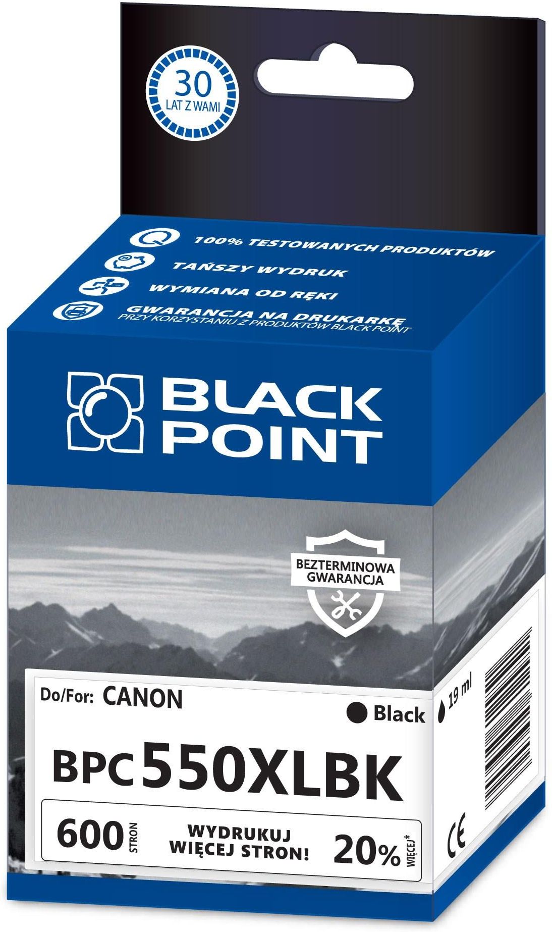 Kartridż atramentowy Black Point BPC550XLBK. Zastepuje Canon PGI-550PGBKXL Wydajnosc: 600str. (więcej o 100 str. - ISO 24711) Pojemnosc: 19ml Kompatybilny z: Canon PIXMA iP7250, MG6350, MG6350, MG5450, MX925, MG7150, MG6450, MG5550, MG7150, iP8750, iX6850, MG6450, MG7550, MG7550, MG6650, MG5650, MX725. Dane Techniczne Wydajność BP 600 NR CN 32159020 Kolor black Gwarancja Dozywotnia Producent OEM Canon Black Point. Bez problemu. Bez małych udoskonaleń świata nie ma wielkich odkryć. Tonery, tusze to małe i czasem kłopotliwe przedmioty. BLACKPOINT wymyślił sposoby ich modyfikacji – ulepszanie druku, bez którego nie byłoby ludzkiej cywilizacji. Dożywotnia gwarancja i wymiana od ręki - to ich wkład w codzienność bez problemu. Środowisko -bez zmian. W naszych firmach i domach trzeba czasem coś wydrukować. Staramy się te mało ekologiczne czynności uczynić jak najmniej bolesnymi dla środowiska naturalnego. Modyfikujemy i usprawniamy działanie materiałów eksploatacyjnych do druku, by Ziemię pozostawić bez zmian – jest wystarczająco udana. Wydajność Black Point – dziś już legendarna. Opatentowany sposób projektowania, produkowania i testowania tuszów i tonerów żeby parametry ich użytkowania były najlepsze na rynku. Szkoda, że drukarki nie mają głosu – BLACKPOINT miałby niezłe wsparcie.