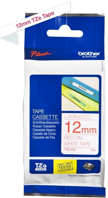 Brother TZe-232 - czerwony nadruk na białym tle, 12mm Laminowana taśma TZe-232 firmy Brother, kompatybilna z drukarkami P-touch. Wszechstronna i czytelna, dzięki czerwonemu nadrukowi na białym tle. Stanowi przydatne narządzenie do znakowania zarówno w domu, w biurze, jak i w innych miejscach. Główne cechy 12mm szerokości, 8m długości Wysokiej jakości oryginalna taśma firmy Brother Zapewnia wyraźne i trwałe rezultaty Oryginalna taśma TZe-232 firmy Brother. Gwarantuje wyraźne, trwałe i czytelne etykiety.   Sprawdzi się zarówno w domu, biurze jak i w innym miejscu pracy. Laminowana taśma TZe-232 z czerwonym nadrukiem na białym tle. Etykiety mają wszechstronne zastosowanie - od identyfikacji akt osobowych i szafek, przez pamięć USB aż po inne aktywa.   Samoprzylepne etykiety są wytrzymałe temperaturowo, odporne na chemikalia, wodę, ścieranie. Mogą być zatem stosowane zarówno wewnątrz jak i na zewnątrz.   Taśmy TZe są łatwe i szybkie w montażu. Występują w wielu kolorach i rozmiarach, a także materiałach. Taśmy TZe z pewnością sprostają Twoim oczekiwaniom w zakresie etykiet.