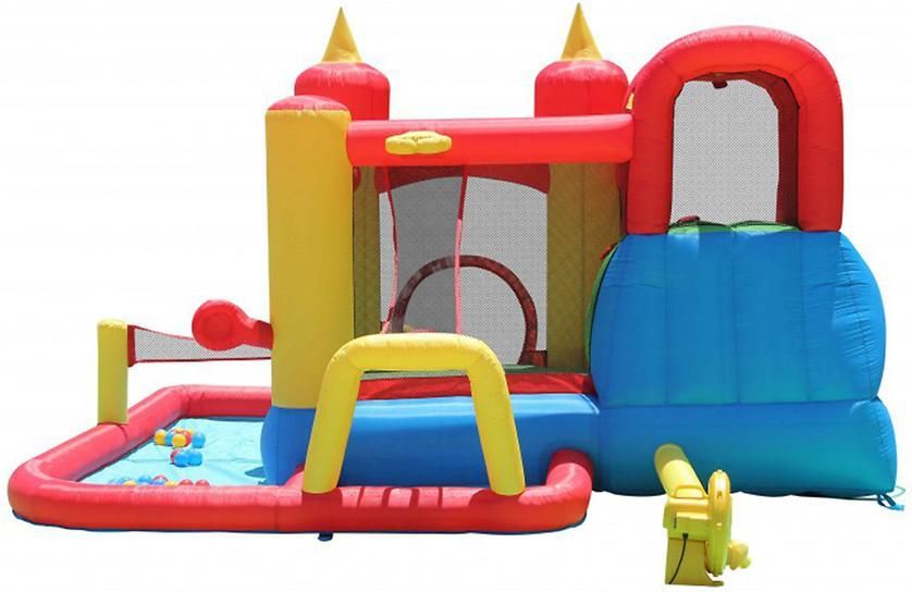 Dmuchany plac zabaw Zamek wodny 410x385x220 cm – Królewska zabawa dla dzieci! Dmuchany plac zabaw Zamek wodny 410x385x220 cm to fantastyczne centrum zabawy, które zapewni dzieciom mnóstwo radości i aktywności na świeżym powietrzu. Dzięki dmuchanej trampolinie ze zjeżdżalnią, armatce wodnej, polu do rzutów oraz siatce do gry w siatkówkę, maluchy mogą cieszyć się różnorodnymi atrakcjami, rozwijając przy tym sprawność fizyczną. Solidna konstrukcja z PVC i podwójnie laminowanego nylonu gwarantuje trwałość i odporność na intensywną zabawę. Najważniejsze cechy dmuchanego placu zabaw Zamek wodny: Przestronne wymiary 410x385x220 cm – idealne dla 5 dzieci jednocześnie. Dmuchana trampolina ze zjeżdżalnią – dla jeszcze więcej skoków i radości. Armatka wodna – dodatkowa frajda w upalne dni. Pole i siatka do gry w siatkówkę – sportowe emocje w ogrodzie. Pole do rzutów – świetna zabawa i trening celności. Miejsce na uzupełnienie wodą – można stworzyć mini basen dla ochłody. Mocna i odporna konstrukcja – wykonana z trwałego PVC i podwójnie laminowanego nylonu. Bezpieczna zabawa – maksymalne obciążenie 180 kg (45 kg na użytkownika). Ekspresowe nadmuchiwanie – tylko 60 sekund! – dzięki dmuchawie o dużej mocy. Łatwe mocowanie – 4 szpile mocujące zapewniają stabilność konstrukcji. Praktyczna torba transportowa – ułatwia przechowywanie i transport. Dodatkowy zestaw naprawczy – na wypadek drobnych uszkodzeń. Dane techniczne: Wymiary: 410 x 385 x 220 cm Materiał: PVC + podwójnie laminowany nylon Maksymalne obciążenie: 180 kg (łącznie), 45 kg (pojedynczy użytkownik) Ilość dzieci jednocześnie: 5 Czas nadmuchiwania: ok. 60 sekund Zawartość zestawu: ✔ Dmuchawa o dużej mocy ✔ 4 szpile mocujące ✔ 4 szpile do mocowania dmuchawy ✔ Zestaw naprawczy ✔ Torba do przenoszenia Dlaczego warto wybrać dmuchany plac zabaw Zamek wodny? Mnóstwo atrakcji w jednym! – skakanie, zjeżdżanie, siatkówka, armatka wodna i pole do rzutów! Szybki montaż i stabilność – gotowy do zabawy w 60 sekund! Bezpieczna i solidna konstrukcja – wytrzymałe materiały i stabilne mocowanie. Idealny na gorące dni – możliwość uzupełnienia wodą dla dodatkowego ochłodzenia. Łatwy transport i przechowywanie – torba w zestawie ułatwia przenoszenie.