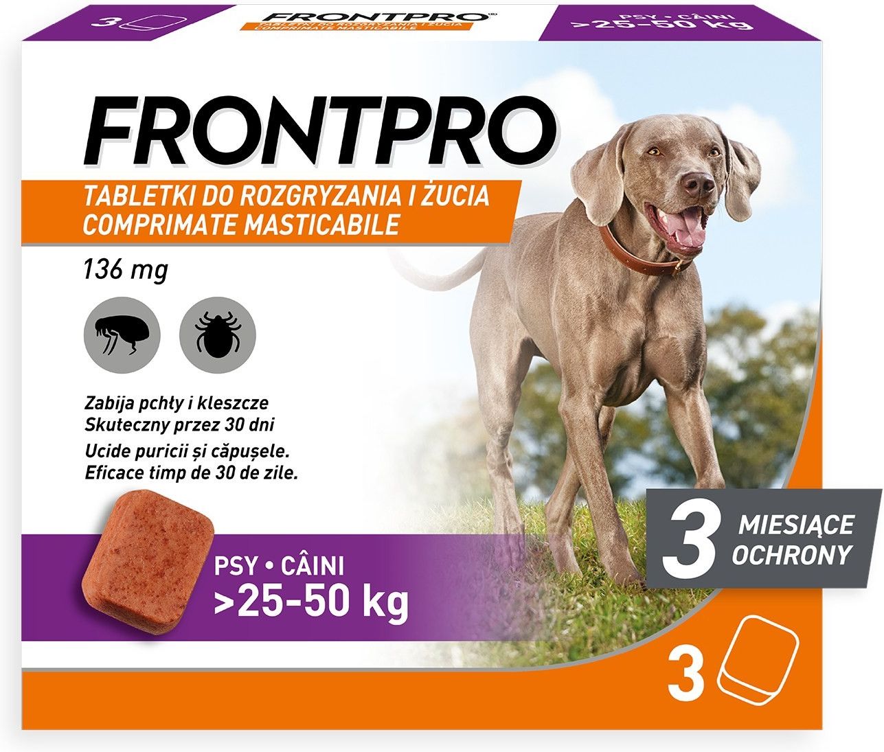 FRONTPRO 136 mg tabletki do rozgryzania i żucia dla psów 25-50 kg POSTAĆ FARMACEUTYCZNA Tabletki do rozgryzania i żucia. Tabletki marmurkowe, czerwone do  czerwonobrązowych, prostokątne tabletki  do rozgryzania i żucia. SKŁAD JAKOŚCIOWY I ILOŚCIOWY FRONTPRO Tabletki do rozgryzania i żucia dla psów >25-50 kg, 136,0 Afoksolaner  (mg)   WSKAZANIA LECZNICZE DLA KAŻDEGO Z DOCELOWYCH GATUNKÓW ZWIERZĄT Leczenie inwazji pcheł (Ctenocephalides felis i C. canis). Jednorazowe podanie zapewnia natychmiastową i trwałą eliminację  pcheł przez 5 tygodni. Zmniejszenie ryzyka zakażenia Dipylidium caninum przenoszonego przez Ctenocephalides felis przez okres 30 dni. Efekt jest pośredni i wynika z działania weterynaryjnego produktu leczniczego przeciwko wektorowi. Leczenie inwazji kleszczy u psów (Dermacentor reticulatus,  Ixodes ricinus, Ixodes hexagonus, Rhipicephalus sanguineus, Hyalomma marginatum,). Jednorazowe podanie zapewnia natychmiastową i trwałą eliminację kleszczy przez jeden miesiąc. Zmniejszenie ryzyka zakażenia Babesia canis przenoszonego przez Dermacentor reticulatus przez okres 28 dni. Efekt jest pośredni i wynika z działania weterynaryjnego produktu leczniczego przeciwko wektorowi. Substancja czynna oddziałuje na pchły i kleszcze, które rozpoczęły pożywianie się na gospodarzu NAZWA I ADRES PODMIOTU ODPOWIEDZIALNEGO Boehringer Ingelheim Vetmedica GmbH, 55216 Ingelheim/Rhein, Niemcy. ADRES PRZEDSTAWICIELA PODMIOTU ODPOWIEDZIALNEGO Boehringer Ingelheim Sp. z o.o., ul. Józefa Piusa Dziekońskiego 3, 00-728 Warszawa, tel. 22 699 06 99