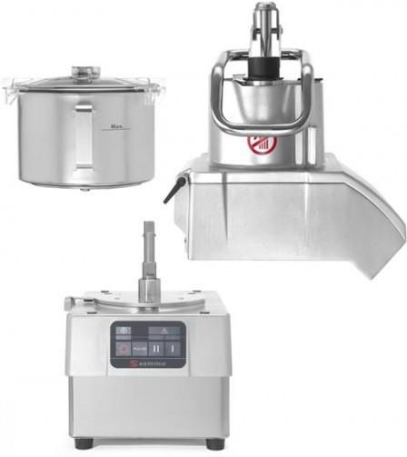 Roboty wielofunkcyjne Sammic łączą w sobie zalety użytkowania szatkownic ze zmienna prędkością wraz z kutrami-emulgatorami. Oferta składa się 4 modeli. Każdy z nich wyposażony jest w 3 podstawowe elementy: 1 BLOK Z SILNIKIEM (wspólny do wszystkich modeli maszyn wielofunkcyjnych) - Blok silnika wykonany z wysokiej klasy stopu aluminium - Przyjazny dla użytkownika elektroniczny, wodoszczelny panel sterujący z podświetleniem LED. - Timer pozwalający na programowanie czasowe pracy w zakresie od 0 do 10 min ze skokiem co 0,5 minuty - Przycisk trybu pracy pulsacyjnej (tylko dla wolnych obrotów) - Wyświetlacz prędkości, czasu i kodów błędów - Silnik chłodzony wentylatorem pozwalający na pracę ciągłą do 30 minut (potem przerwa około 10 minut) - Mikrowyłącznik bezpieczeństwa blokujący obroty silnika gdy głowica szatkownicy lub zbiornik emulgatora nie są zamontowane, lub zamontowane są nieprawidłowo - Łatwy w użytkowaniu i utrzymaniu w czystości 2 GŁOWICA SZATKOWNICY DO WARZYW - Przeznaczona do rozdrabniania warzyw za pomocą szerokiej gamy tarcz i kratek dostępnych jako OPCJA możliwość uzyskania różnej grubości plastrów, wiórków, słupków, kostek oraz frytek - Wykonana z odlewu aluminiowych, wyróżnia się wysoką wytrzymałością oraz przystosowaniem do intensywnej pracy - Wyposażona w duży podajnik na warzywa: 136 cm2 lub aż 286 cm2 (w zależności od modelu) - Boczny otwór wylotowy na gotowy produkt pozwalający na ustawienie maszyny na małej powierzchni roboczej - Aż 5 prędkości cięcia od 365 do 1000 obr./min - Profilowany dysk ewakuacyjny zwiększający wydajność urządzenia - Wydajność: od 150 do aż 650 kg/godz. (w zależności od modelu) - Konstrukcja dźwigni dociskowej z obrotową rączką minimalizuje obciążenie łokcia i nadgarstka - Łatwo demontowana dźwignia i pokrywa ułatwiająca czyszczenie - UWAGA: tarcze należy zamawiać osobno 3 ZBIORNIK KUTRA-EMULGATORA - Przeznaczony do rozdrabniania, siekania, mielenia i mieszania wszelkich produktów, takich jak warzywa i zioła, mięsa surowe i gotowane, ryby, owoce, orzechy, kostki lodu oraz do zagniatania wszelkiego rodzaju ciast - W szczególności przeznaczony do pracy z płynami - 10 dostępnych prędkości od 365 do 3000 obr./min - Zdejmowany zbiornik ze stali nierdzewnej (5,5 lub 8-litrowy w zależności od modelu) z pokrywą z poliwęglanu z otworem pozwalającym na dodawanie składników podczas pracy urządzenia - W komplecie nóż ząbkowany - Zgarniak służący do dodatkowego mieszania PARAMETRY TECHNICZNE - ilość prędkości (szatkownica) 5 - zakres prędkości (szatkownica) regulowana od 300 do 1 000 obr./min - ilość prędkości 10 - zakres prędkości (cutter) regulowana od 300 do 3 000 obr./min - moc/napięcie 1500 W/230 V - średnica tarczy (szatkownica) o205 mm - poziom hałasu <70 dB