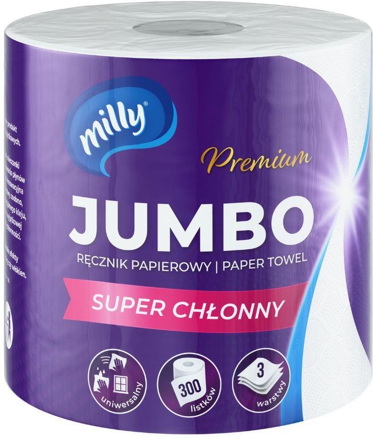 Milly Premium ręcznik papierowy 3 warstwy – super chłonnyMilly Jumbo to trzywarstwowy produkt o doskonałych właściwościach użytkowych. Dzięki wykorzystaniu specjalnej mieszanki włókien, jego zdolność do absorbowania płynów została maksymalnie zwiększona.Innowacyjna technologia tłoczenia każdej warstwy osobno umożliwiła stworzenie ręcznika o wyjątkowej wytrzymałości i bardzo wysokiej chłonności. Co więcej, zapewnia on doskonałe efekty czyszczenia bez pozostawiania smug czy włókien.