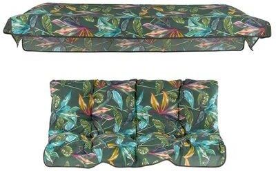Ten wyjątkowy komplet poduszek z daszkiem to idealne rozwiązanie dla każdego, kto pragnie odmienić wygląd swojej huśtawki ogrodowej, nadając jej świeżości i komfortu. Tkanina w modny, botaniczny wzór z liśćmi w odcieniach zieleni, błękitu i złota wprowadza egzotyczny klimat i doskonale komponuje się z ogrodowym otoczeniem.