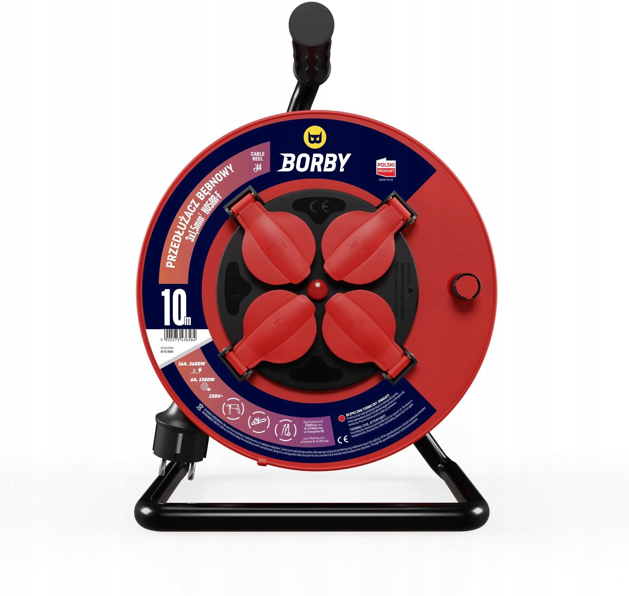 Przedłużacz bębnowy Guma 10m 3x1,5mm Borby BY-02-36584 Borby Przedłużacz bębnowy Guma 10m 3x1,5mm Borby BY-02-36584 - Ciesz się polską jakością! Przedłużacz bębnowy Guma 10m 3x1,5mm Borby BY-02-36584 to funkcjonalne i poręczne rozwiązanie do zasilania różnorodnych urządzeń elektrycznych. Wyprodukowany w Polsce, charakteryzuje się solidną budową oraz wysokiej jakości materiałami, co zapewnia niezawodność i długotrwałe użytkowanie. Długość przewodu wynosząca 10 metrów sprawia, że idealnie nadaje się do użytku zarówno w pomieszczeniach, jak i na zewnątrz, gdzie istotna jest mobilność i elastyczność. Przedłużacz posiada cztery gniazda typu niemieckiego, co umożliwia podłączanie wielu urządzeń jednocześnie, zwiększając wydajność pracy. Maksymalne obciążenie wynoszące 16 A (3680 W) pozwala na podłączenie sprzętu o dużym zapotrzebowaniu na energię, co czyni go doskonałym do zastosowań w warsztatach, ogrodach i podczas prac budowlanych. Przewód o przekroju 3x1,5 mm² z żyłą H05RR-F zapewnia skuteczne przewodzenie prądu, co minimalizuje straty energii i zwiększa efektywność. Gumowa izolacja chroni przedłużacz przed uszkodzeniami mechanicznymi oraz niekorzystnymi warunkami atmosferycznymi. Dzięki klasie ochrony IP44, urządzenie jest odporne na wodę i ciała stałe, co zwiększa jego wszechstronność zarówno wewnątrz, jak i na zewnątrz. Dodatkowe funkcje bezpieczeństwa, takie jak uziemienie, przesłony torów prądowych i bezpiecznik termiczny, dbają o ochronę przed przeciążeniem oraz ryzykiem porażenia prądem. Dzięki tym funkcjom, użytkownicy mogą bez obaw korzystać z narzędzi elektrycznych i innych urządzeń podłączonych do przedłużacza. Borby przedłużacz bębnowy z gumową izolacją - Borby łączy to, co najlepsze! Kompaktowe wymiary i funkcjonalność – 10-metrowa długość przewodu zapewnia wygodę i elastyczność, umożliwiając łatwe użytkowanie w różnych lokalizacjach, zarówno wewnątrz, jak i na zewnątrz budynków. Duża moc i obciążenie – Maksymalna moc 3680 W oraz obciążenie 16 A pozwalają na bezpieczne zasilanie sprzętu o dużej mocy, co jest szczególnie istotne dla elektronarzędzi. Odporność na niekorzystne warunki – Dzięki gumowej izolacji i klasie ochrony IP44, przedłużacz jest odporny na wilgoć i kurz, co sprawia, że idealnie nadaje się do użytku na zewnątrz w zmieniających się warunkach atmosferycznych. Bezpieczeństwo użytkowania – Wyposażony w funkcje ochrony, takie jak uziemienie, przesłony torów prądowych oraz bezpiecznik termiczny, przedłużacz gwarantuje ochronę przed porażeniem prądem i przegrzaniem, co zwiększa bezpieczeństwo pracy. Solidna polska produkcja – Wyprodukowany w Polsce, przedłużacz charakteryzuje się wysoką jakością wykonania, trwałością i niezawodnością, co zapewnia długowieczność i bezawaryjne działanie. Wielofunkcyjne gniazda – Cztery gniazda typu niemieckiego pozwalają na jednoczesne podłączenie kilku urządzeń, co zwiększa efektywność i komfort pracy w różnych zadaniach. Ochrona przewodu w różnych stanach – Przedłużacz ma precyzyjnie określone parametry pracy zarówno w stanie złożonym (6 A/1380 W), jak i rozwiniętym (16 A/3680 W), co zapobiega przeciążeniom i uszkodzeniom przewodu. Łatwe przechowywanie i transport – Dzięki zwijanemu bębnowi, przedłużacz jest łatwy do przechowywania i transportu, co pozwala na wygodne użytkowanie i organizację przestrzeni. Przedłużacz bębnowy Guma 10m Borby - Niezawodność i moc na każde zadanie! Przedłużacz bębnowy Guma 10m 3x1,5mm Borby BY-02-36584 to produkt wysokiej jakości, łączący kompaktowe wymiary z dużą funkcjonalnością. Dzięki solidnej konstrukcji, gumowej izolacji i klasie ochrony IP44, przedłużacz doskonale sprawdza się w różnorodnych warunkach, zarówno wewnętrznych, jak i zewnętrznych. Wyposażony w cztery gniazda typu niemieckiego, oferuje możliwość jednoczesnego zasilania wielu urządzeń, co zwiększa efektywność pracy. Polska jakość produkcji gwarantuje trwałość i niezawodność, a dodatkowe funkcje bezpieczeństwa, takie jak uziemienie i bezpiecznik termiczny, zapewniają ochronę przed przeciążeniem i przegrzaniem. To idealne rozwiązanie dla użytkowników, którzy cenią sobie funkcjonalność, bezpieczeństwo oraz komfort w codziennym użytkowaniu. Zobacz też: Przedłużacz bębnowy Borby BY-02-56591. Zobacz też: Przedłużacze bębnowe. Napięcie: 230V Moc: 3680W Długość przewodu zasilającego: 10m Typ gniazda: French Type Obciążenie: 16A Ilość gniazd: 4 Typ izolacji: Gumowa Przekrój przewodu: 3x1,5mm Stopień ochrony: IP44 Małe wymiary z przewodem o długości 10m Duża moc oraz maksymalne obciążenie 3680W Gumowa izolacja odporna Wysoka jakość produkcji w Polsce