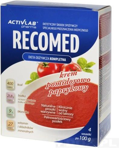 RecoMed, Krem Pomidorowy, proszek, 4 saszetki Środek spożywczy kompletny pod względem odżywczym o składzie uwzględniającym zapotrzebowanie organizmu do odżywiania osób w okresie rekonwalescencji po chorobie, operacji, niedożywionych, wyniszczonych. RecoMed zawiera wszystkie niezbędne składniki odżywcze: białko, węglowodany, tłuszcz, błonnik pokarmowy oraz komplet witamin i składników mineralnych. Skoncentrowana forma produktu ułatwia podawanie i nie obciąża dodatkowo organizmu chorego. Białko obecne w produkcie to najwyższej jakości koncentrat białka serwatkowego (WPC) o wartości biologicznej BV 104. Skład aminokwasowy białka został ponadto zoptymalizowany przez dodanie aminokwasów w proporcjach niezbędnych do zwiększenia wartości odżywczej białka – uzyskania optymalnych proporcji aminokwasów egzogennych (EAA) zalecanych w dziennym spożyciu przez Swiatową Organizacje Zdrowia (WHO). Wskazania: Do postępowania dietetycznego w niedożywieniu związanym z chorobą np. nowotworową oraz u osób: • przewlekle chorych • wymagających rekonwalescencji po operacjach chirurgicznych • w podeszłym wieku Sposób użycia: RecoMed może być stosowany jako jedyne źródło pożywienia (6 porcji dziennie) lub jako uzupełnienie diety lub jej częściowe zastępowanie (1-3 porcje dziennie).