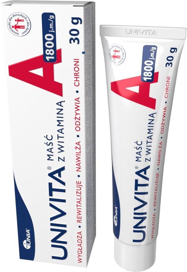 Univita, Maść z witaminą A, 1800j.m./g, 30g WYGŁADZA, REWITALIZUJE, NAWILŻA, ODŻYWIA, CHRONI. UNIVITA maść z witaminą A, 1800 j.m./g to produkt kosmetyczny do codziennej pielęgnacji skóry dorosłych i dzieci, które ukończyły pierwszy rok życia, niewykazujących uczulenia na którykolwiek ze …