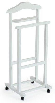 Wieszak do sypialni MIRANO biały lakierowany to elegancki i kompaktowy stojak garderobiany, stworzony z myślą o codziennym przechowywaniu odzieży w uporządkowany i stylowy sposób. Dzięki prostej formie, nowoczesnemu białemu wykończeniu i solidnej konstrukcji z litego drewna bukowego, idealnie pasuje zarówno do klasycznych, jak i minimalistycznych wnętrz. Model MIRANO wyposażony jest w jeden profilowany wieszak, doskonały do przechowywania koszul, marynarek czy bluz, a także uchwyt na spodnie oraz półkę z litego drewna na drobiazgi takie jak zegarek, portfel, okulary czy biżuteria. Gumowe kółka u podstawy zapewniają mobilność i chronią podłogi przed zarysowaniami. Całość można szybko i łatwo zmontować, co czyni ten mebel wyjątkowo praktycznym. Długość: 37 cm. Wysokość: 105 cm. Szerokość: 46 cm. Masa: 5 kg.
