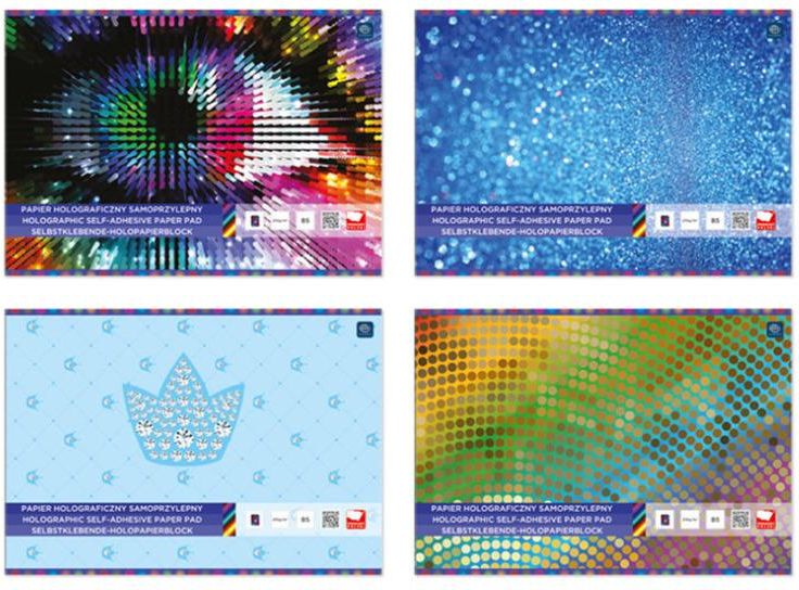 Zeszyt papierów kolorowych samoprzylepnych pokrytych folią holograficzną, format B5, 6 kartek, wzory: kropki i gwiazdki, kolory: żółty, pomarańczowy, czerwony, zielony, niebieski i czarny. Produkt idealny do wszelkich prac kreatywnych.