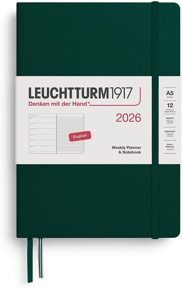 Leuchtturm 1917 Planer Tygodniowy Z Notatnikiem W Linię Twardej Oprawie 2026 En A5 Leśna Zieleń Pniewy
